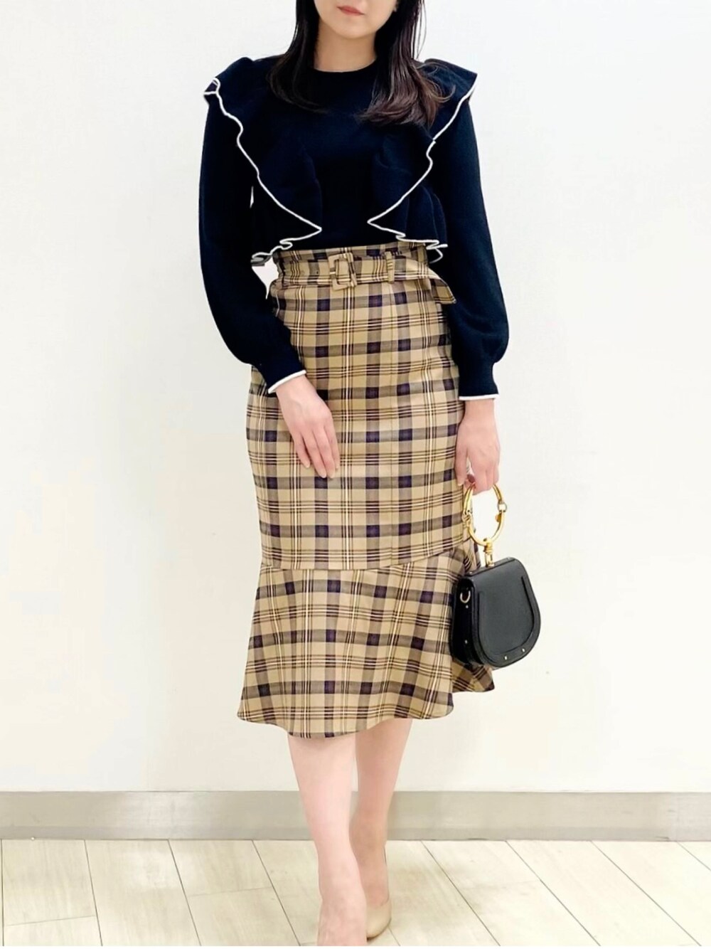 皆様こんばんは✨くどうです🙋🏻♀️ 店舗で人気のチェックスカートを着てみました‼︎ トレンドのマーメイドラインの膝下丈です☺︎ とても女性らしい印象で 厚手ニットもブラウスも合わせられて 着まわし力も高いですよね💓 このチェック柄、可愛くないですか?☺️ もっと寒くなったら黒タイツを合わせて履きたい👍🏻 タイツ合わせも柄が映えて絶対可愛いと思います〜♫ お店で売れているのも納得‼︎という感想です😂笑 . . フリルのニットは少し厚手のタイプ✍️ 今はまだ暑くて着れないかもしれませんが、 是非持っておきたい1着です‼︎ このニットはインして着た時に 素晴らしい魅力を発揮します😁 フリルがインしても可愛いく見える様に 高めに設定されているんですよね✨ そして‼︎ ショート丈のトップスを着ているかの様な スッキリなシルエットを叶えてくれます‼️ 気になる腰周りをフリルの配色ラインが 良い仕事をしてくれて スタイルUP効果が抜群ですねー🤩 デニム合わせで カジュアルにも着るのもオススメです✨