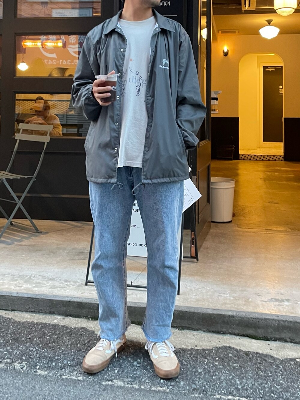 アウター羽織ってなかから見えるロゴT👌