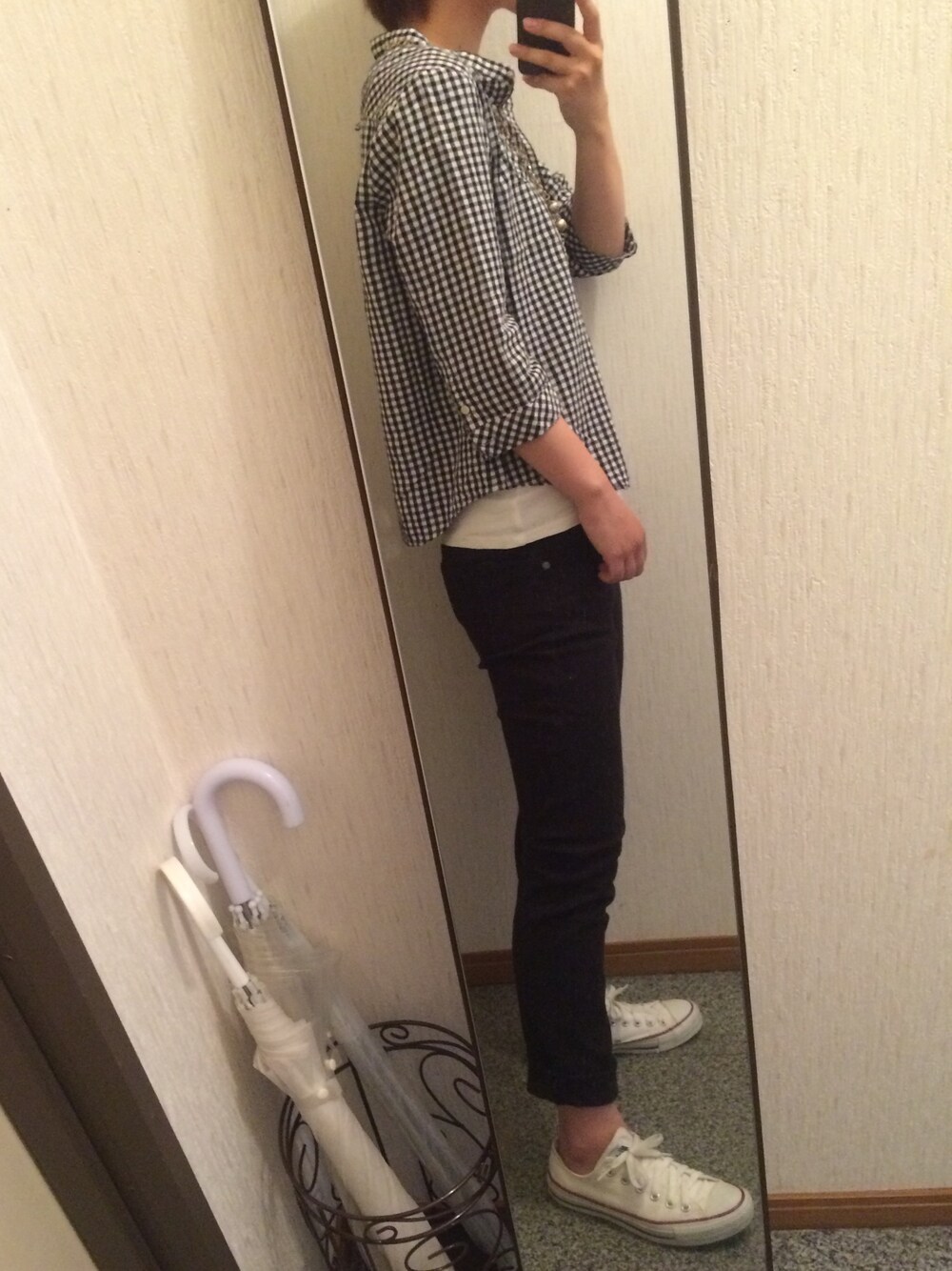 おはようございます☺️ ギンガムチェックシャツとブラックスキニー、スニーカーとなんでもないコーデですが… とにかく動きやすい、をメインに。 明日は引越し! 今日も笑顔でがんばろー😆