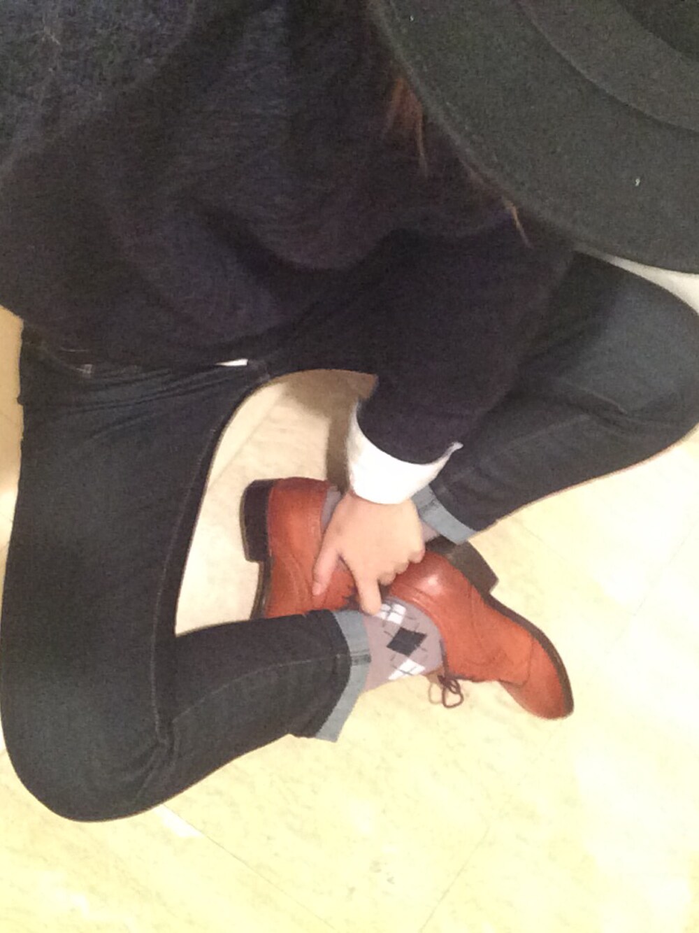 イネス×ユニクロのあったかケーブルニット 定番のホワイトシャツ インディゴデニム かっちり革靴 そのままメンズも着られそうなマニッシュコーデ