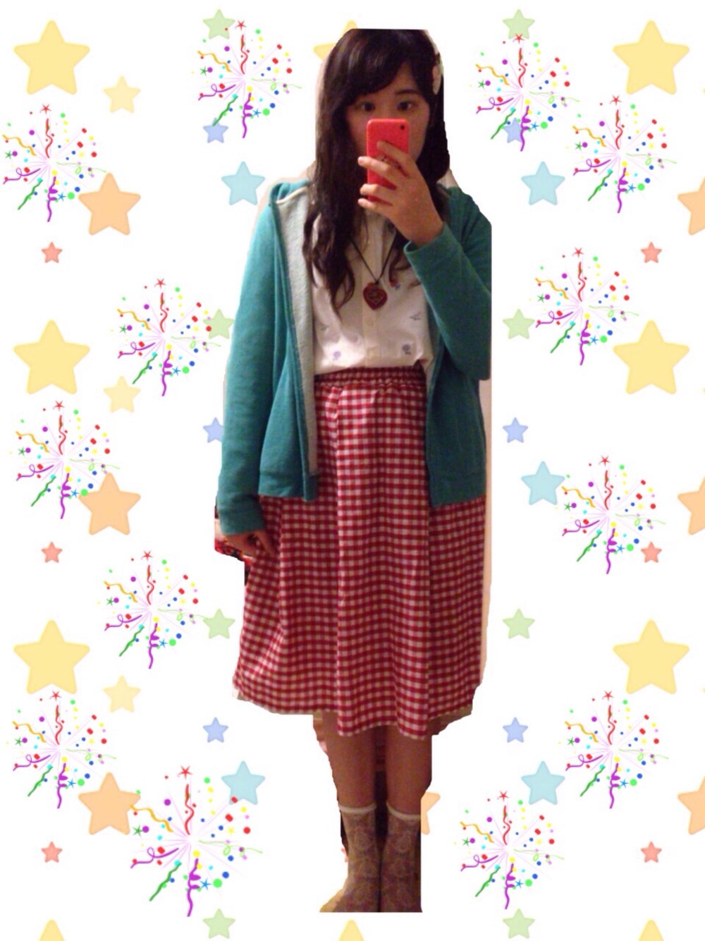 猫背で妊婦さんっぽくなってしもうた 赤いギンガムチェックのスカートずっと欲しくてこないだ下北のお気に入りのセレクトショップで買ってきました(^◇^)
