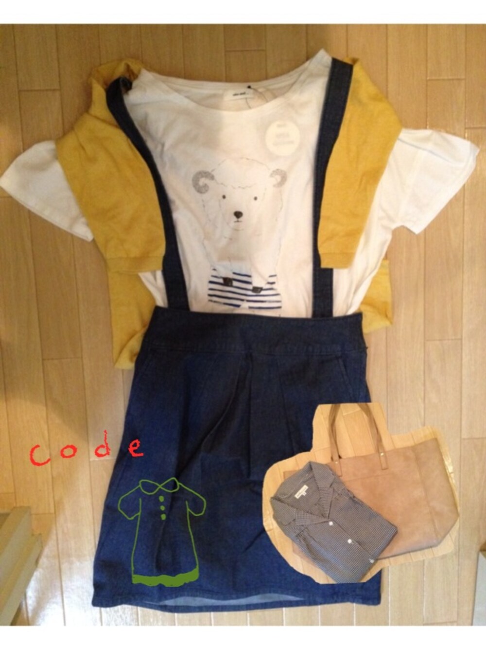 0514 かったもの Tシャツ▽ niko and ... デニムタイトスカート ギンガムシャツ.バック▽ earth