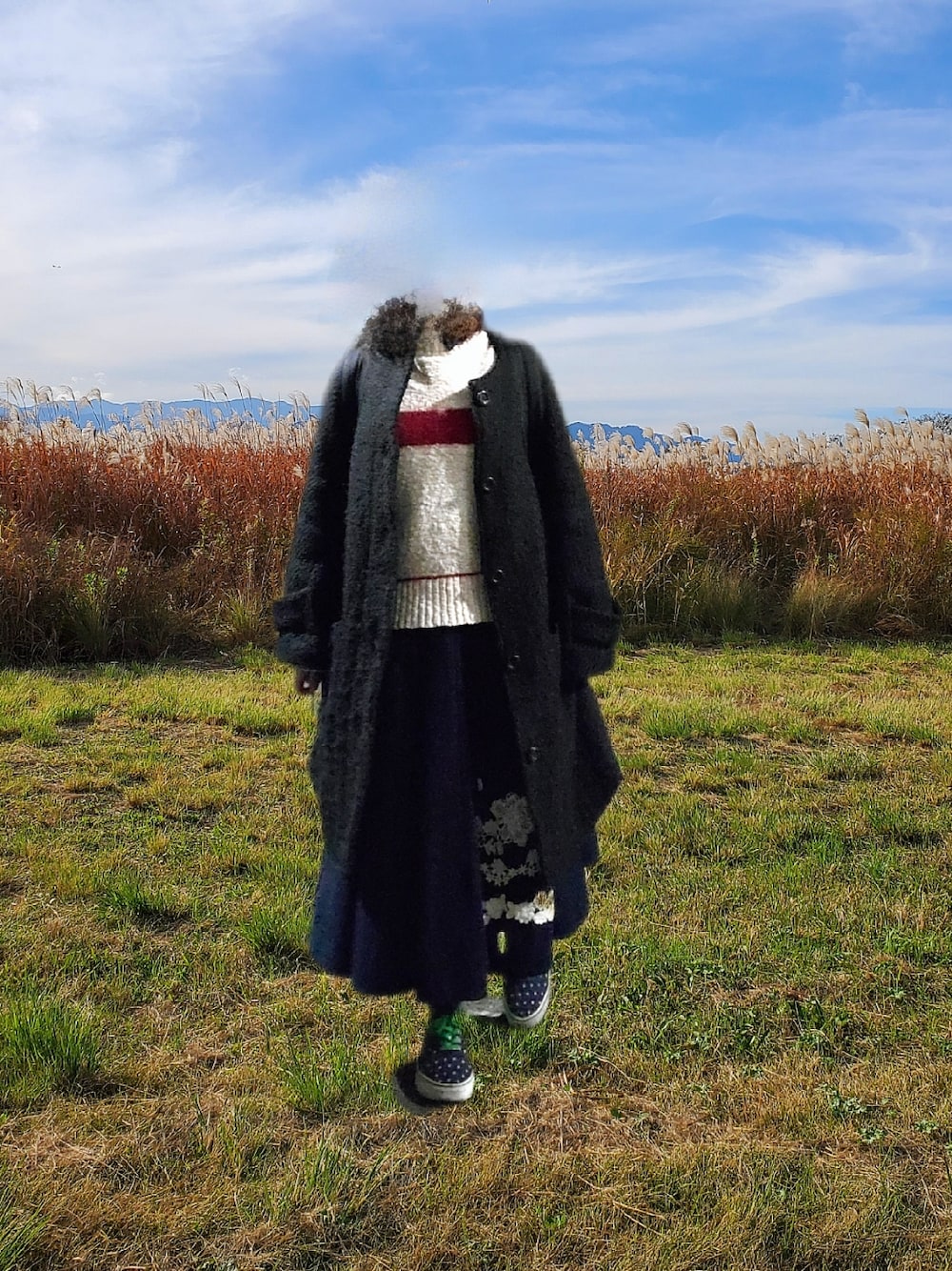 布の量が多くて生地が厚いスカートは 中に重ね着し放題のため毛糸のパンツと 長いレギンスと長い靴下を重ね着することができ、 真冬にぴったりのアイテム ウエストに余裕がありすぎるため おそらく臨月になっても着続けられる 大きいセーターが乾燥機で縮んだため 密度が高く真冬にぴったりのアイテム 襟が紺