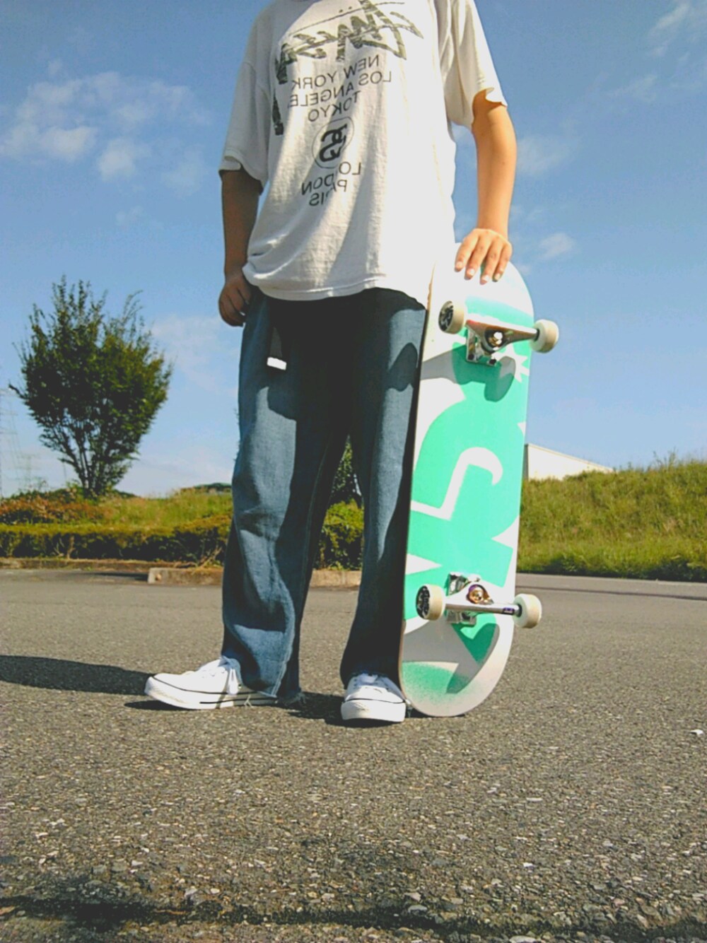 朝8時ぐらいからスケボーの練習してます! ちょっとだけ乗れてきた😋🎵 今日はスケータースタイル!