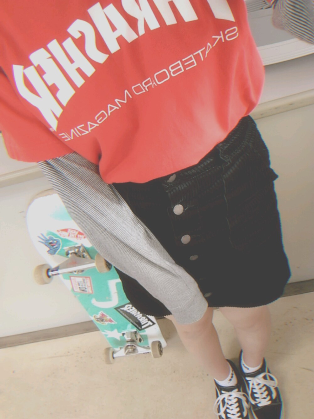 今日のコーデ❤️😍✨Withスケボー😎✨ 久しぶりのスカート履いてみました😚❤️もう少し痩せたい。。 ダイエット中です笑笑😂安定の🔥THRASHER 🔥今日は、スケボーdayじゃなくて勉強dayになりそうです😭あした模試なんで。。