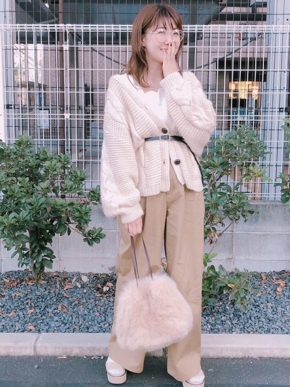 ° 全身ベージュコーデ🙋♀️ ニットカーデに 細ベルト🙆♀️ おしゃれ女子風で だてめがねも🧐 しまむらのファーバッグは 高見えバッグ✨
