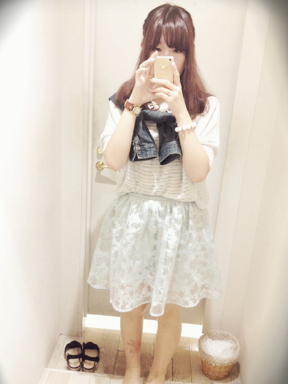 だんだん暑くなってきて やっと薄着出来るようになった(*´ー`) ちなみに足の痣みたいなやつは タトゥータイツです 今年はあまり流行らないかな スカート: UR ニット: 不明