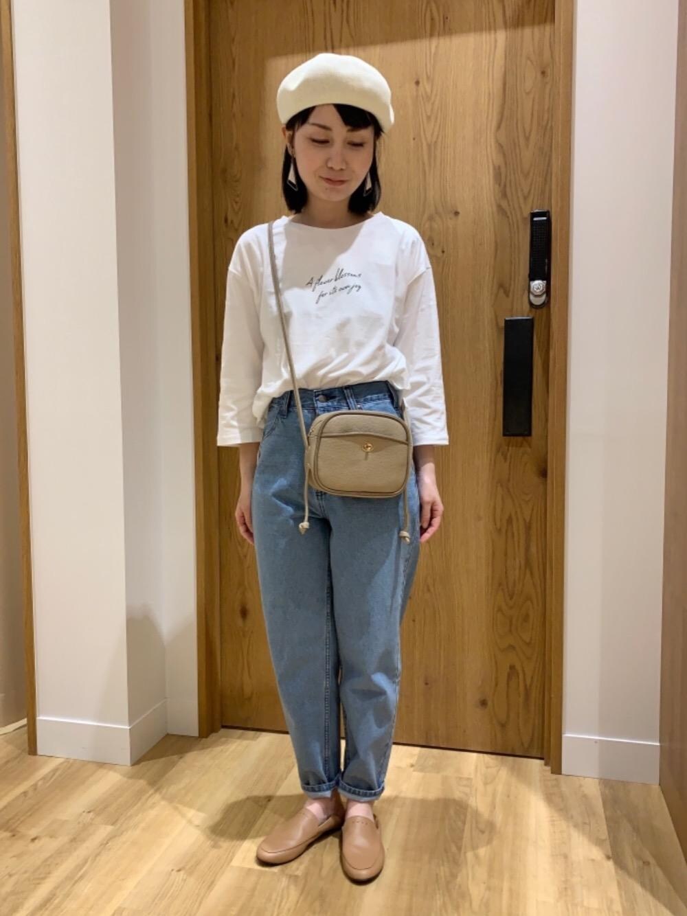 シンプルな7分袖ロゴTシャツに、デニムをあえて薄いライトブルーで合わせて、爽やかさをアップしました。ロゴTシャツはキッズにも同じデザインのものがあり、親子コーデができます。デニムやベレー帽などの小物もカラー違いなどでお揃いにすると、親子コーデがより一層楽しめます。7分袖Tシャツはこれから梅雨時期、秋口にも着用できるおすすめアイテムです。 商品名:ロゴプリント7分袖Tシャツ サイズ感:横幅がやや広く、ゆったりしています。生地が薄手なのでインにしても、ダボつくことはありません。 素材感:コットン100%で柔らかく肌触りもいいので、着心地抜群です!これから暑くなる季節に重宝しそう。肌が敏感な方にもおすすめです。