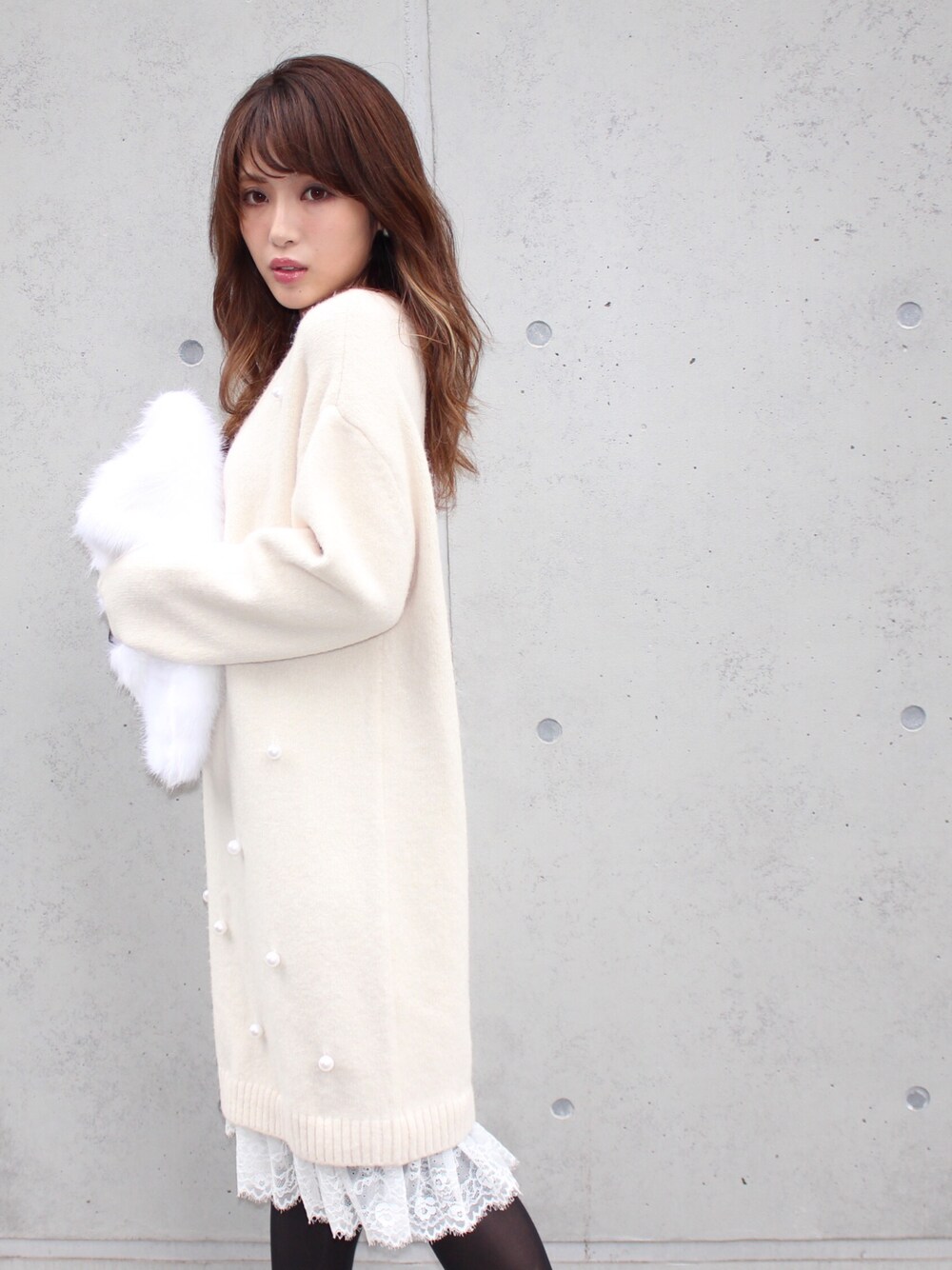 舟山久美子♡くみっきーのワンピース「裾レースVニットワンピ」を使ったコーディネート