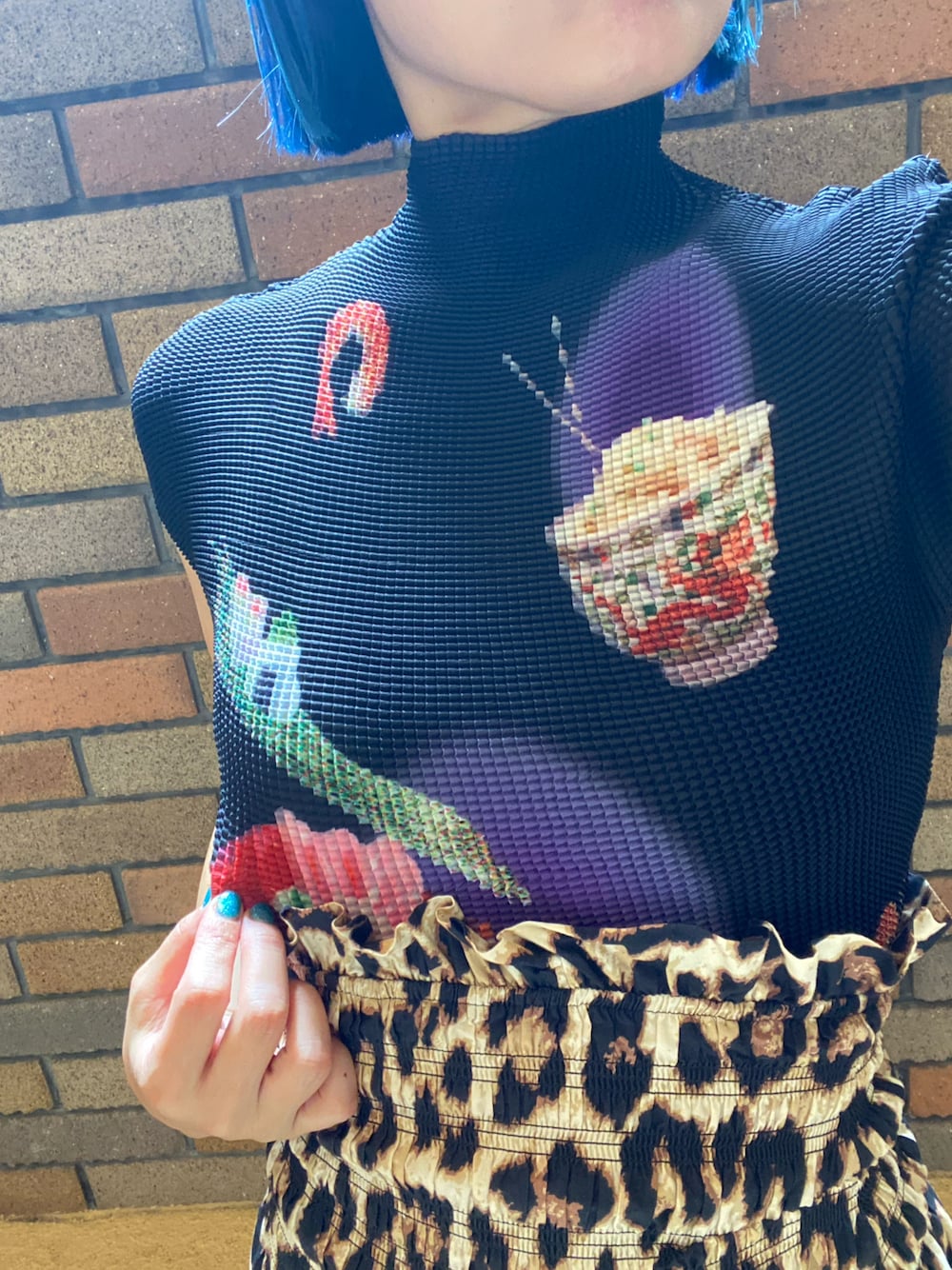 シャレの効いた柄に一目惚れしたトップス🍤🍣 ジャパニーズフード柄? 生地も不思議な感じで伸びるやつ🌀 商品ページではモデルさんヘソ出しだったけど、私はヘソ出ずに着れた👌