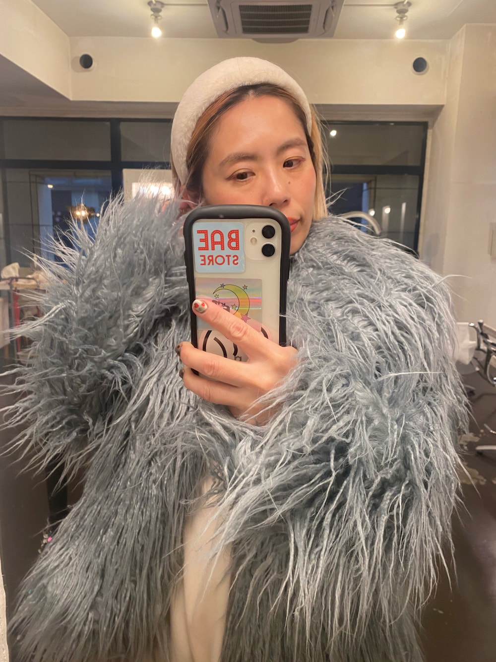 夏に買って温めておいたこちらのファーも解禁🩵 古着っぽくてかわいいけど毛がめっちゃ抜ける笑