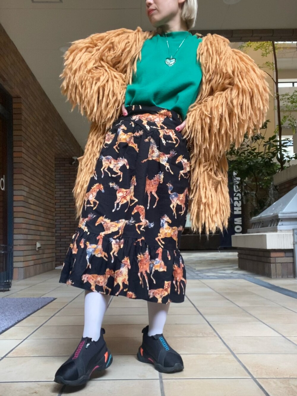 お馬スカートの着回し🫶 お馬スカートの上に何を着るか探す旅に出て、早速お友達のとこで見つけて来たスウェット💚 一見何もないめっちゃシンプルやけど、チビハイネックみたいなデザインでお気に入り💚💚💚