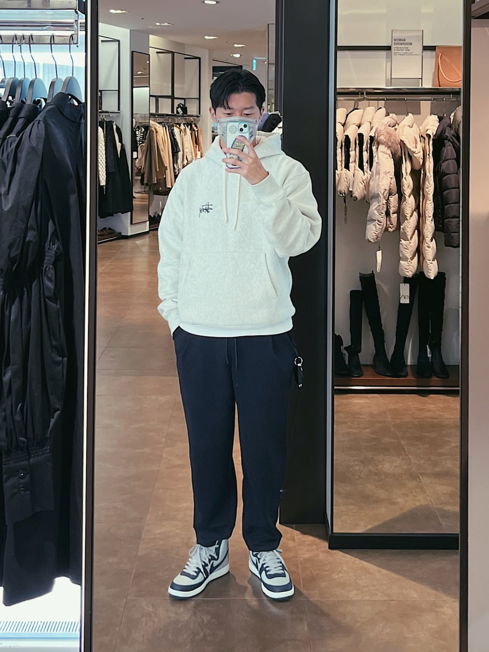 ホワイト系のパーカー、ブラック系のその他パンツ、グレー系のスニーカーを着用したメンズの冬コーディネートの1枚目の写真