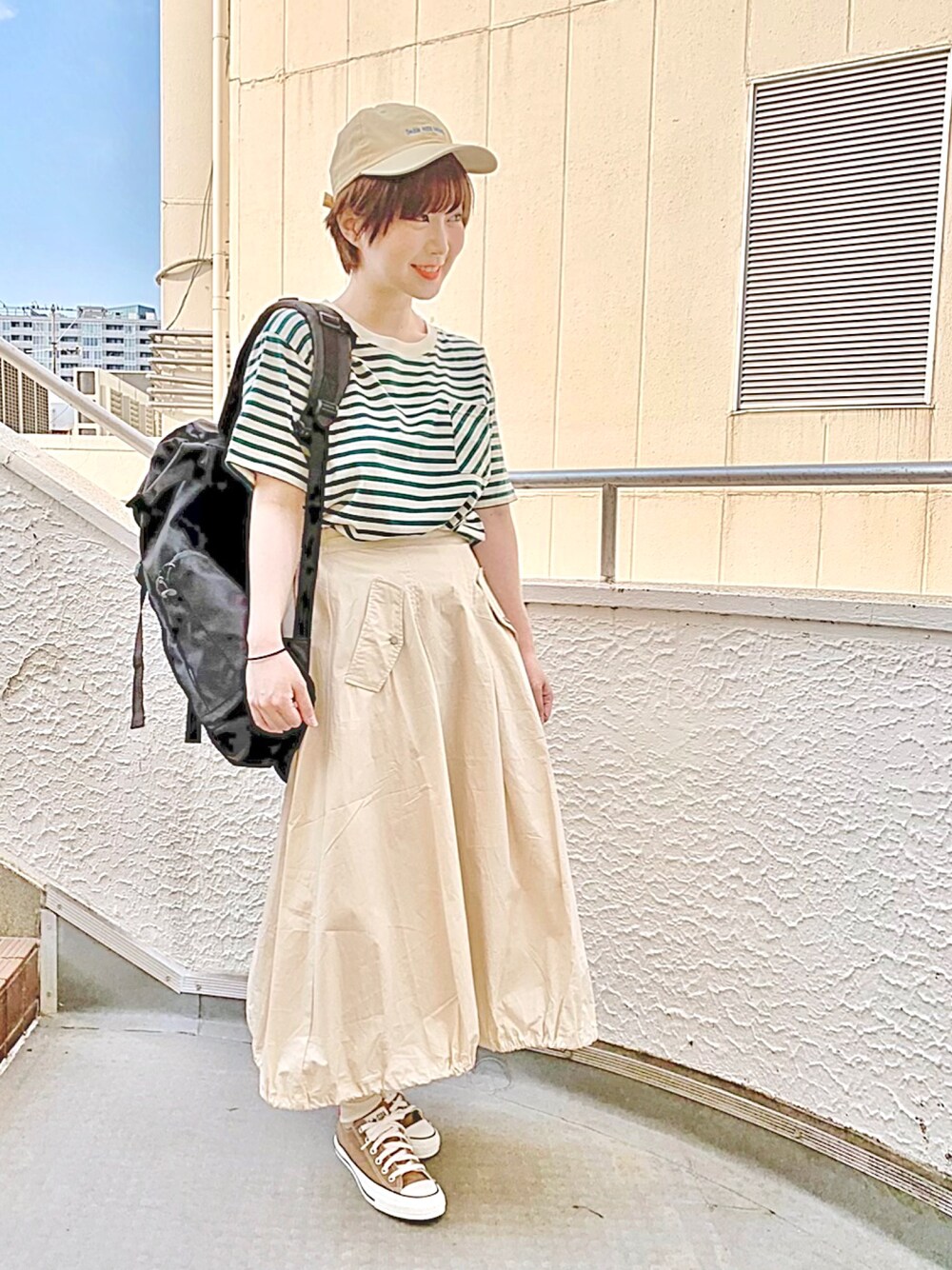 パッと見た感じシンプルコーデ。でも裾部分が配色のドロストになっている、一風変わったシルエットのスカート。シンプルだけど少しパンチや捻りが欲しい!という方にオススメです!