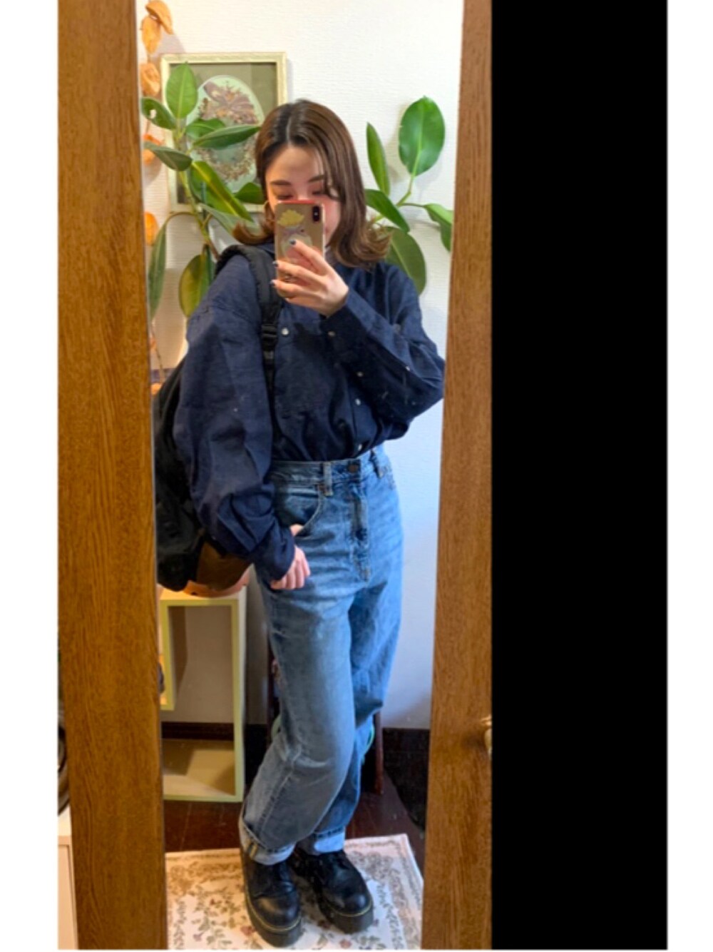 👔UNIQLO デニムシャツ暗めブルー 1290円 👖GU デニムパンツ明るめブルー2990円 🥼vintageのトレンチコート着てます 👩🏽外ハネヘアー