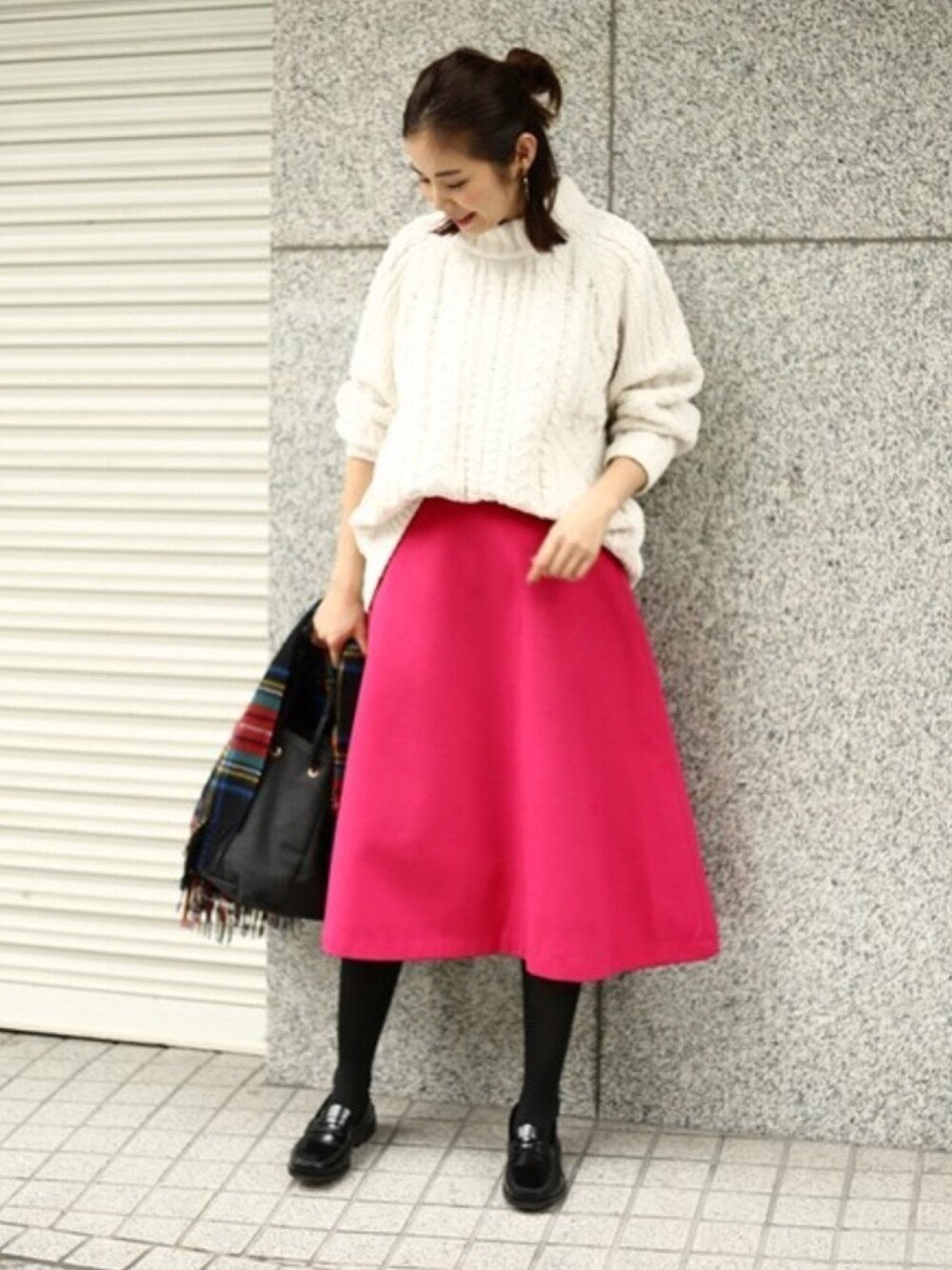 鮮やかなピンクが目を惹くスカートがメインのスタイリングです🍑🍑 絶妙なフレア感がらたまりません! オーバーサイズなケーブルニットで大人カジュアルに💃