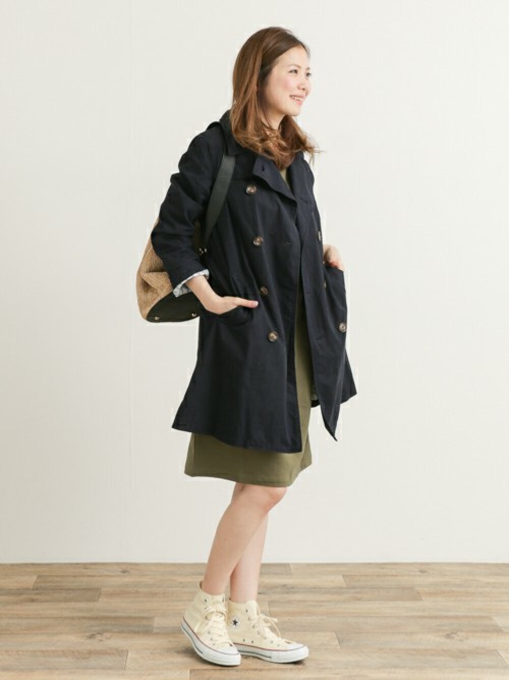 今日はトレンチコートで春を先取り! スニーカー合わせで休日の大人カジュアルコーディネート(^^) 手首からチラッと覗くストライプの裏地もポイント! 今年は、ウエストのベルトを結んでワンピース風に着こなすのもオススメです♪