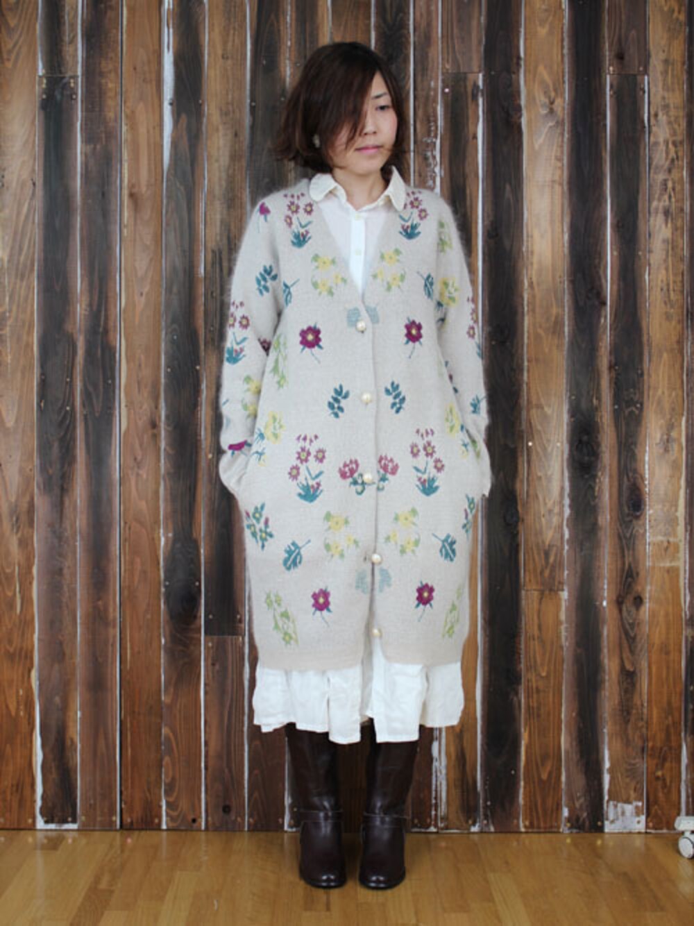 花柄のロングカーディガンとシャツワンピースです。 足元も少し重い印象にしてみました。