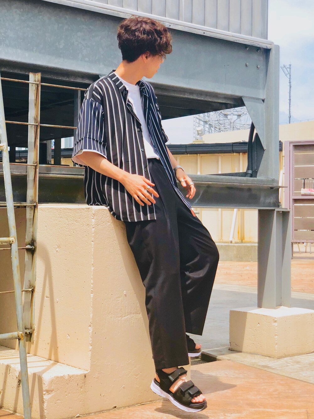 本日のテーマ 『インナーはイン』 明日からまた雨みたいですね、、 悲しいです、、(笑) 本日はLui'sのクレイジーストライプ半袖シャツを使ったスタイリングです! 大トレンドのストライプ柄ですが、こちらのシャツはピッチの違うストライプ素材を組み合わせた、デザイン性の高い一枚になっています! 生地は薄手で涼しく、光沢感があるので上品で綺麗な印象もあります。 パンツは定番の黒ワイドパンツで。 ワイドパンツと合わせる時は、ボタン開けて、シャツを出して、インナーをタックインするスタイルが涼しげで夏らしいので、オススメです👍 足元も涼しげにサンダル。 スニーカーのソールがついていて、流行りにもなっているこのゴツさがGOOD! まるでスニーカー履いてるような感覚で履ける、スポーツサンダルです! 本日は半袖シャツを使ったスタイリングでした! インナーをインして、シャツを出すスタイル、かなり楽でお洒落に見えるので、是非挑戦してみて下さい! いいなと思った方は是非フォロー、お気に入り、いいねなどよろしくお願いします!