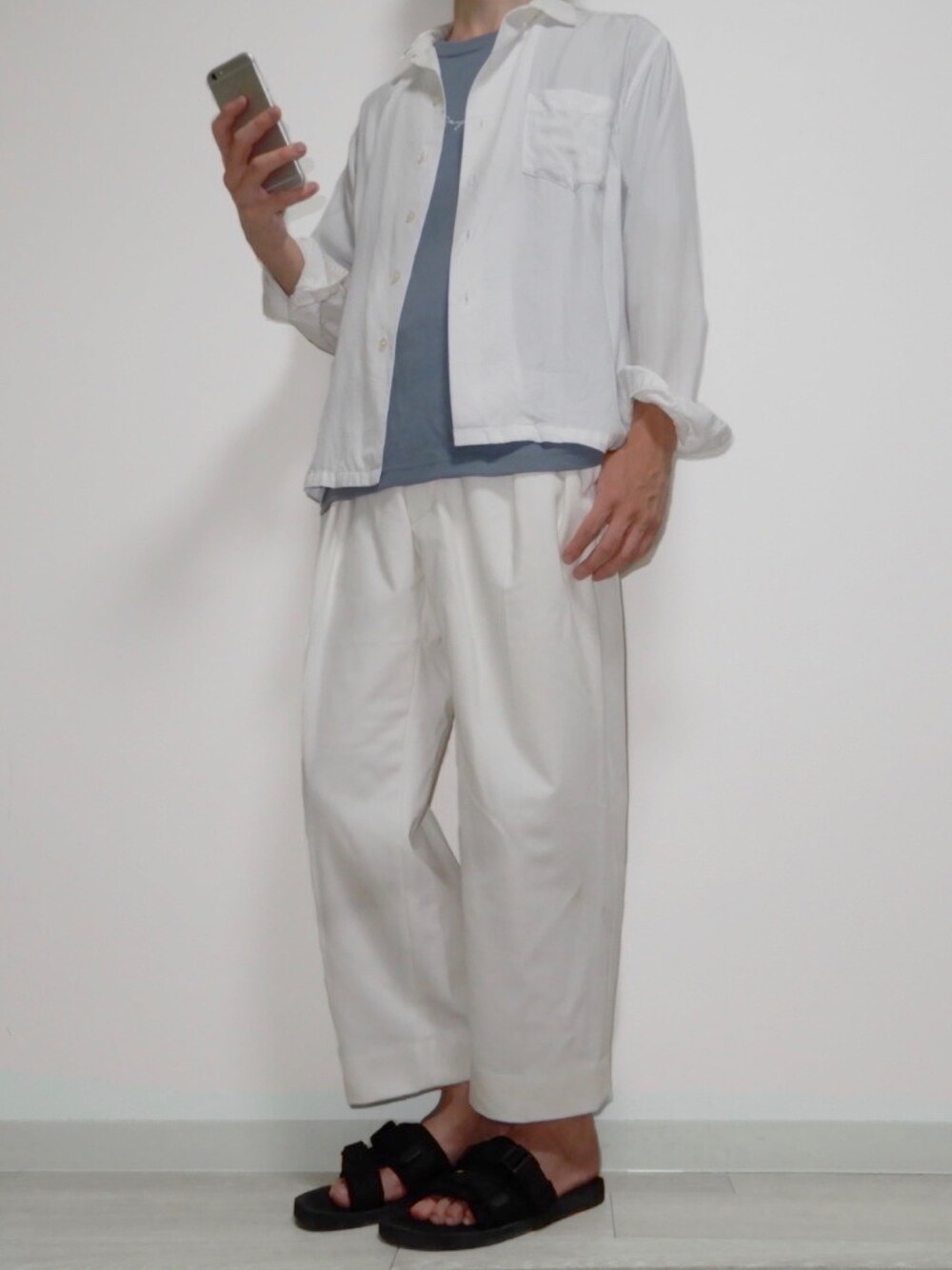 ご閲覧いただきありがとうございます!! 白と青で爽やかカジュアルコーデ。 白シャツや白のワイドパンツはきれいめなイメージですが、プリントTシャツやサンダルを駆使してコーデをカジュアルダウンさせています👍👍