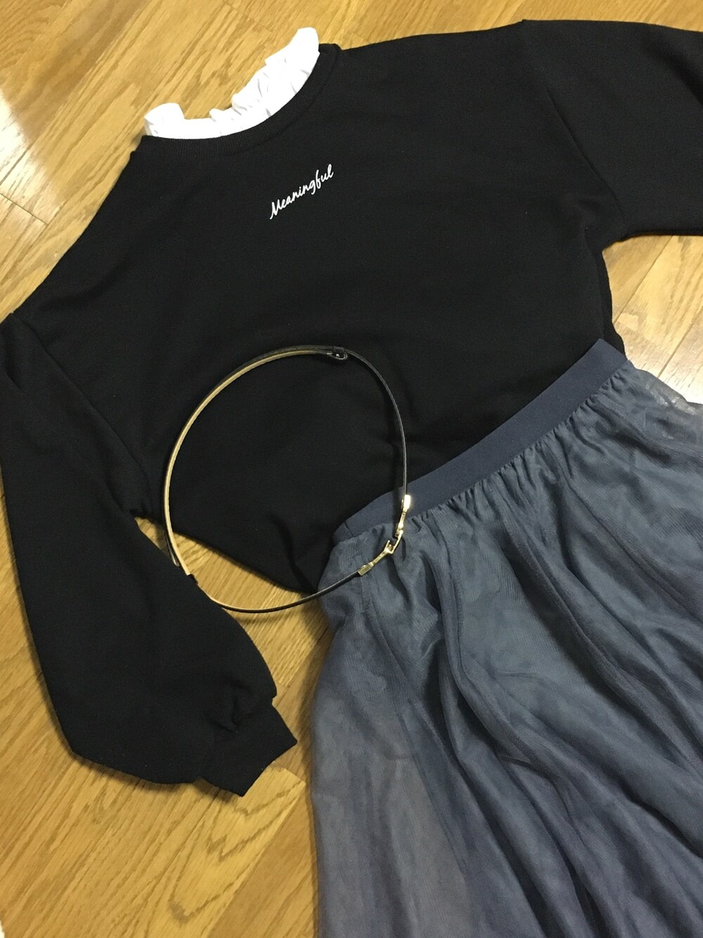 ・黒のロゴスウェット ・白のフリルブラウス ・グレーのチュールスカート ・黒のベルト スウェットやニットにフリルのブラウスを重ね着するの可愛い!