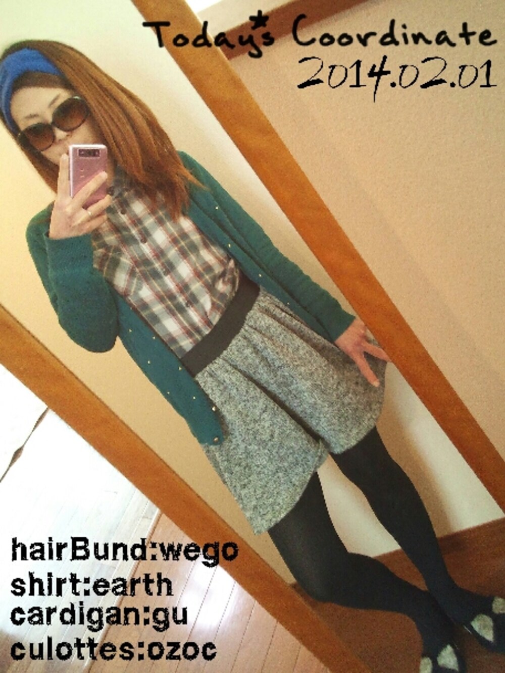 グリーン系のカーディガン/ボレロを着用したレディースの冬コーディネートの1枚目の写真
