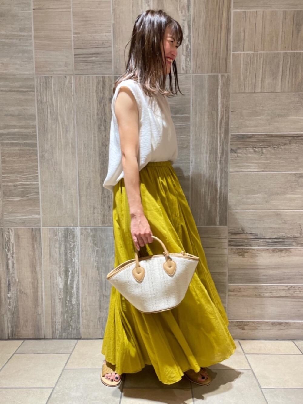 ボリュームのあるスカートをキレイめに合わせました。トップスやシューズを変更してカジュアルめにも合わせていただけます。