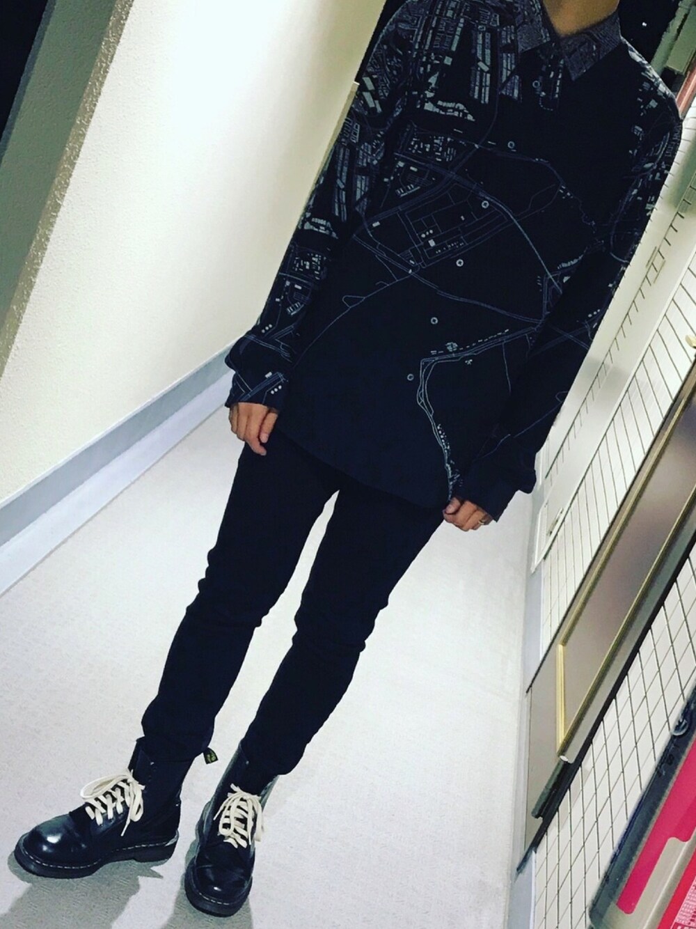 オールブラック。マーチンは古着で買って、メンテナンスをして履いています。シャツはJIL SANDERのもので、かなりお気に入り😳