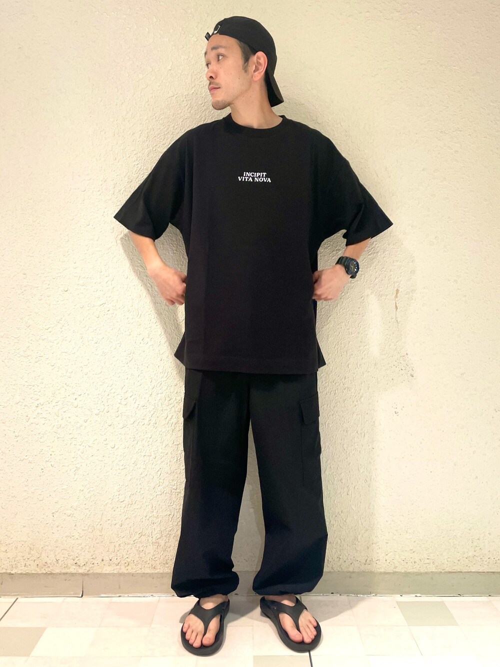 新作のカットソーを使用したワントーンコーディネート。 フロントにもプリントが入っているのでインナー使いにもおすすめです。 ボトムも新作のカーゴパンツを使用。 今季おすすめのナイロン素材のカーゴパンツです! 裾にドローコードがついておりますので、絞って履くのもおすすめです。 171cmでトップス、ボトム共にMサイズ着用しています。