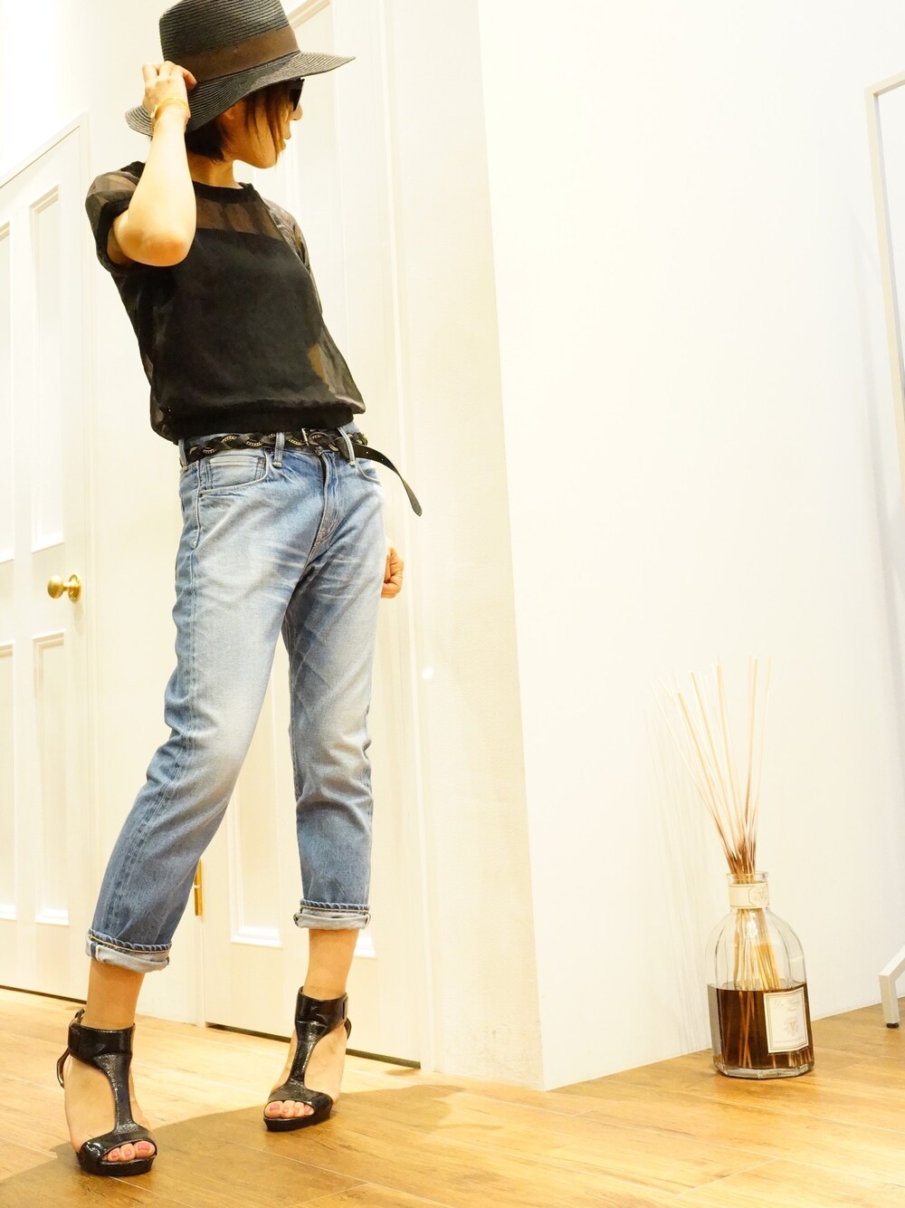 ボーイズライクデニムにブラックの透け感のあるTシャツにブラックサンダルで大人コーデ。 ボーイズライクデニムはいつもよりワンサイズ上を選びました✴︎ 毎日のコーデにも飽きないデニムです。 KUROWOMENS Dempsey VintageWash03