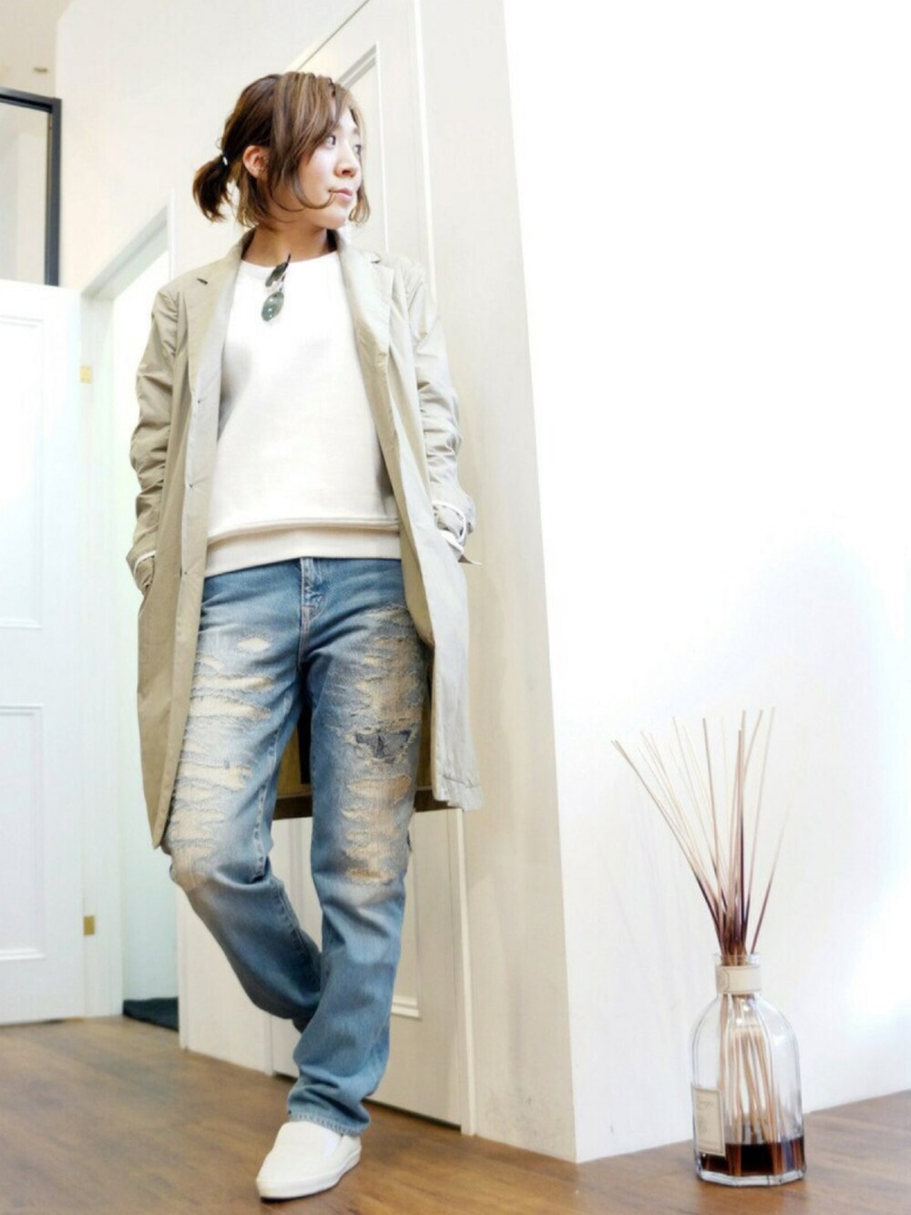 ベージュのコートに激しいダメージの 入ったデニム⚡️ シンプルなニット、コートなので より一層ダメージデニムが生えますね❗️ KURO/12G HEAVYWEIGHT CREWNECK KNIT KURO/80/- TYPEWRITER COAT KUROWOMENS/AULICK/Tight Boyfriend