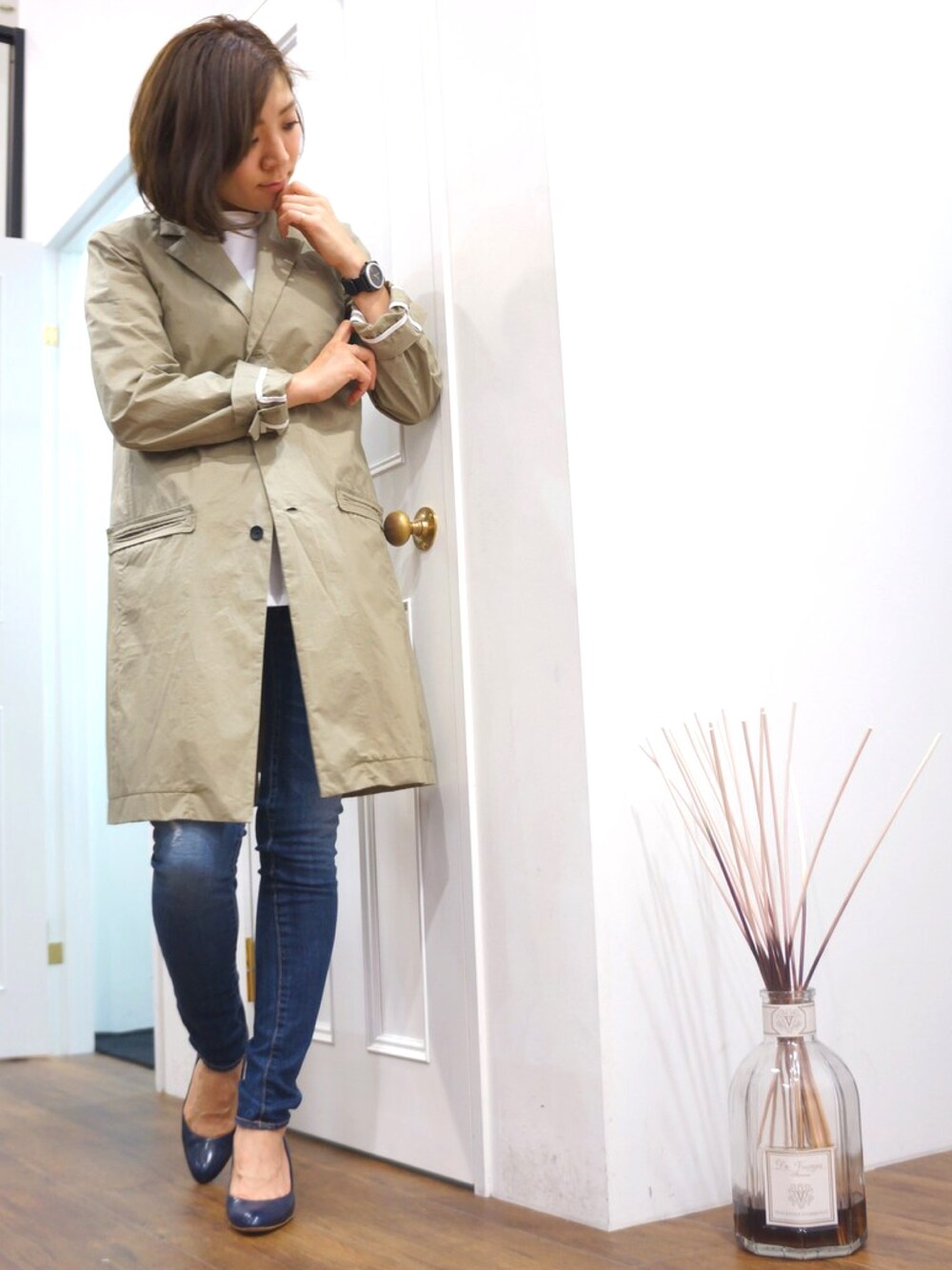 春らしいベージュのスプリングコートに インナーは白のリブティーで春らしさUP👀 パンツはさりげないダメージが施してある スキニーデニムでカッコよく✨✨✨ KURO/TYPE RITER COAT KURO /HEAVY WEIGHT RIB HALF SLEEVE TEE KUROWOMENS /Fibro VintageWash 02