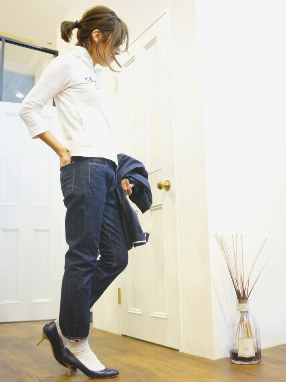 ホワイト×ネイビーの相性抜群のカラーで まとめたシンプルコーディネイト。 暖かい時間帯はパーカー一枚で ラフに着こなし、 夜はまだまだ肌寒いので 手に持っているスプリングコートを 着用して大人っぽく決めるのもアリですね。 KURO / TYPERITER JACKET/NAVY KUROWOMENS / AULICK / ONE WASH