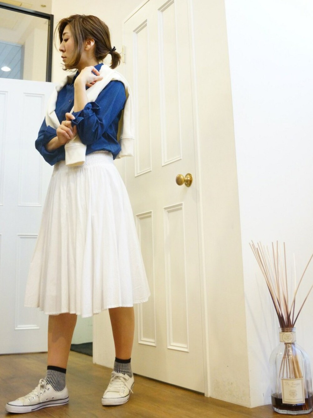 トップス以外を春夏には欠かせないカラー、 ホワイトでまとめたコーデ✨✨✨ 濃いめのインディゴのシャンブレーシャツに トレンドである膝丈のスカートで ガーリーな着こなしに。 膝丈のスカートは大人っぽく着こなせますね。 シャンブレーシャツは薄手でこれから重宝する アイテムなのでオススメですよ😊 KUROWOMENS / CREWNECKダンボールKNIT KUROWOMENS / CHAMBRAY SHIRTS