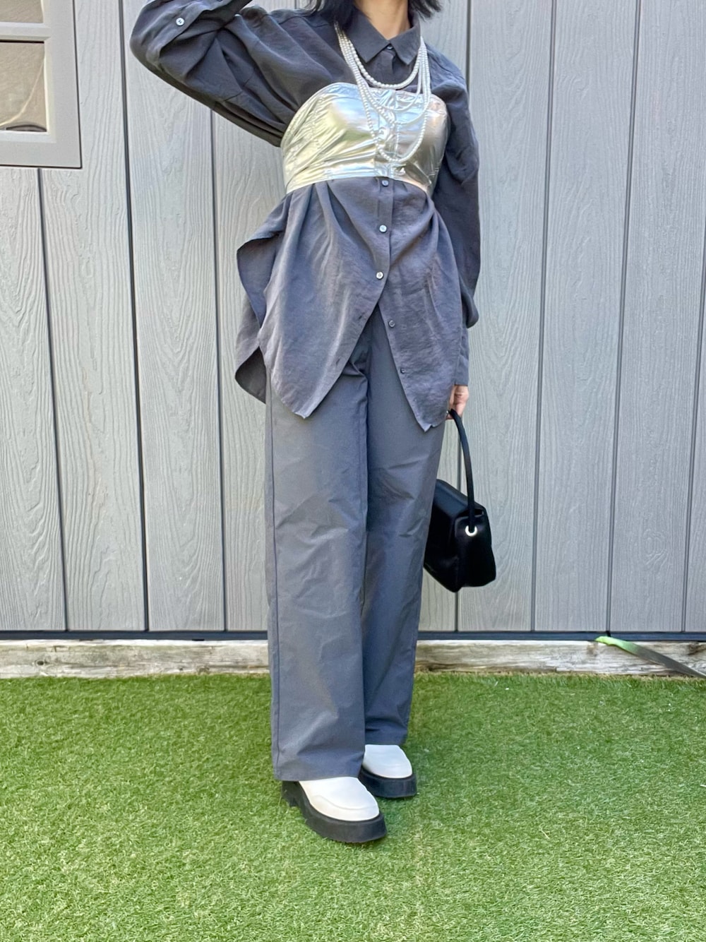 ずっとグレーが苦手だったけど、今年は挑戦しようと思いZARAのグレーのシャツとグレーのカーゴパンツをセットアップ風に着てみました🐭 ビスチェとパールのじゃらじゃらでシンプルになりすぎないコーデに。