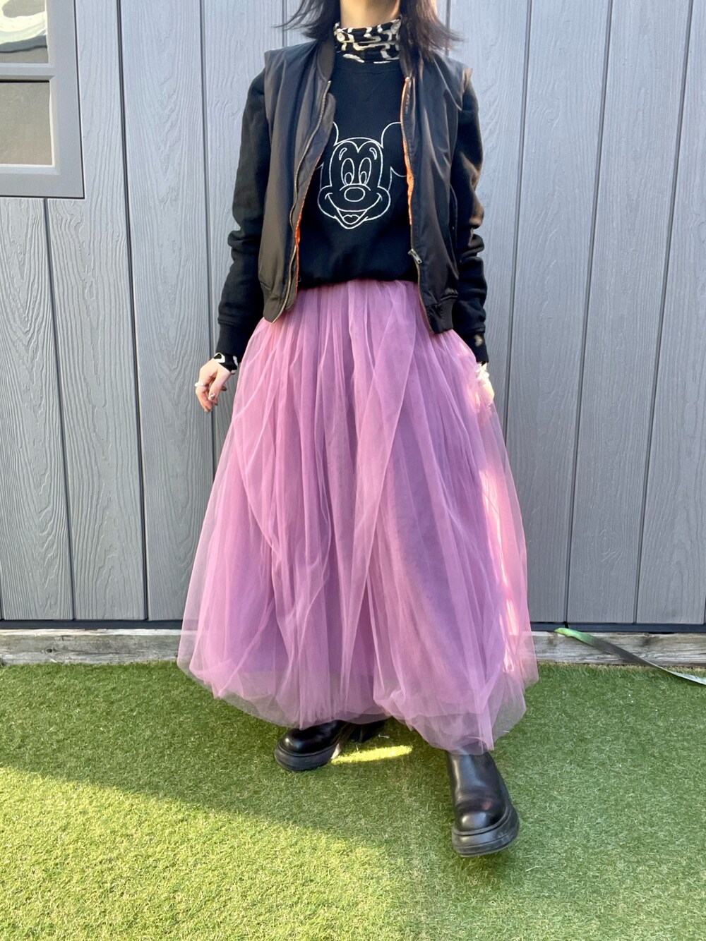 ピンクxブラック🍒 ふわふわのスカートはボリュームがしっかりあって お気に入りです。古着屋さんで見つけました。 スカートがかなり甘めなので他は黒で。 柄のハイネックインナーをスウェットの下に🦓🦓