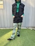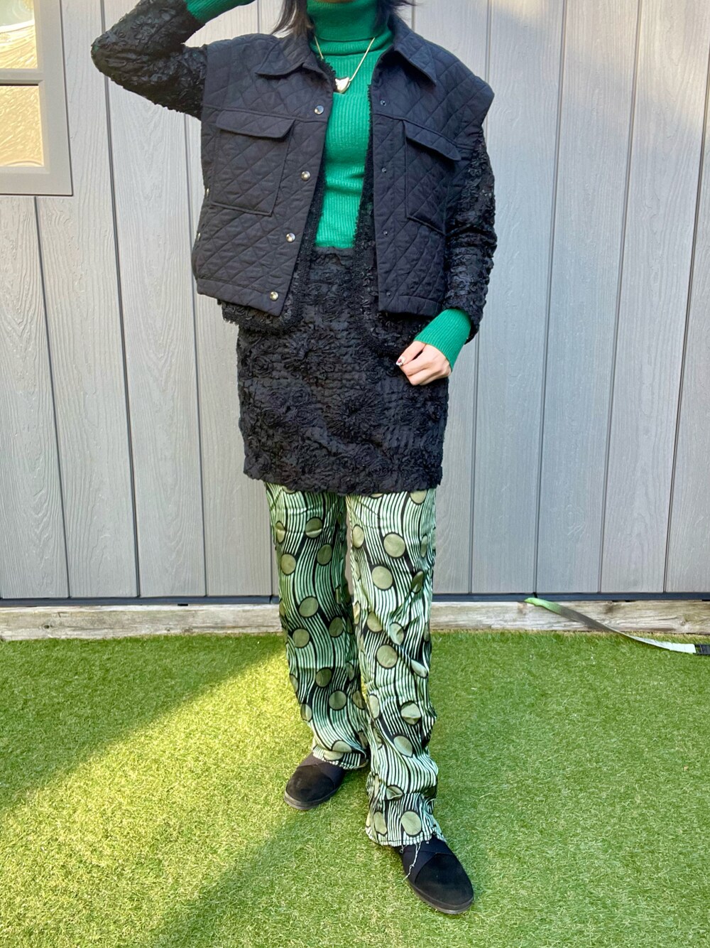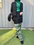 ブラックxグリーン🎄 古着屋さんで見つけたジャケットとスカートの素材感が 似ていたのでセットアップ風に。 その上にキルティングのベストを重ねました。