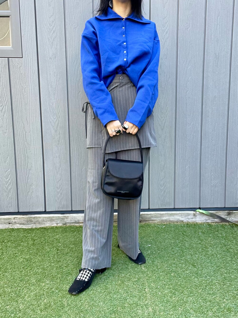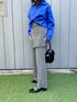 ブルーxグレー🐭 今日は古着の襟付きニットにスカート、パンツのセットで シンプルに。 柄の靴下をポイントに♠️♣️