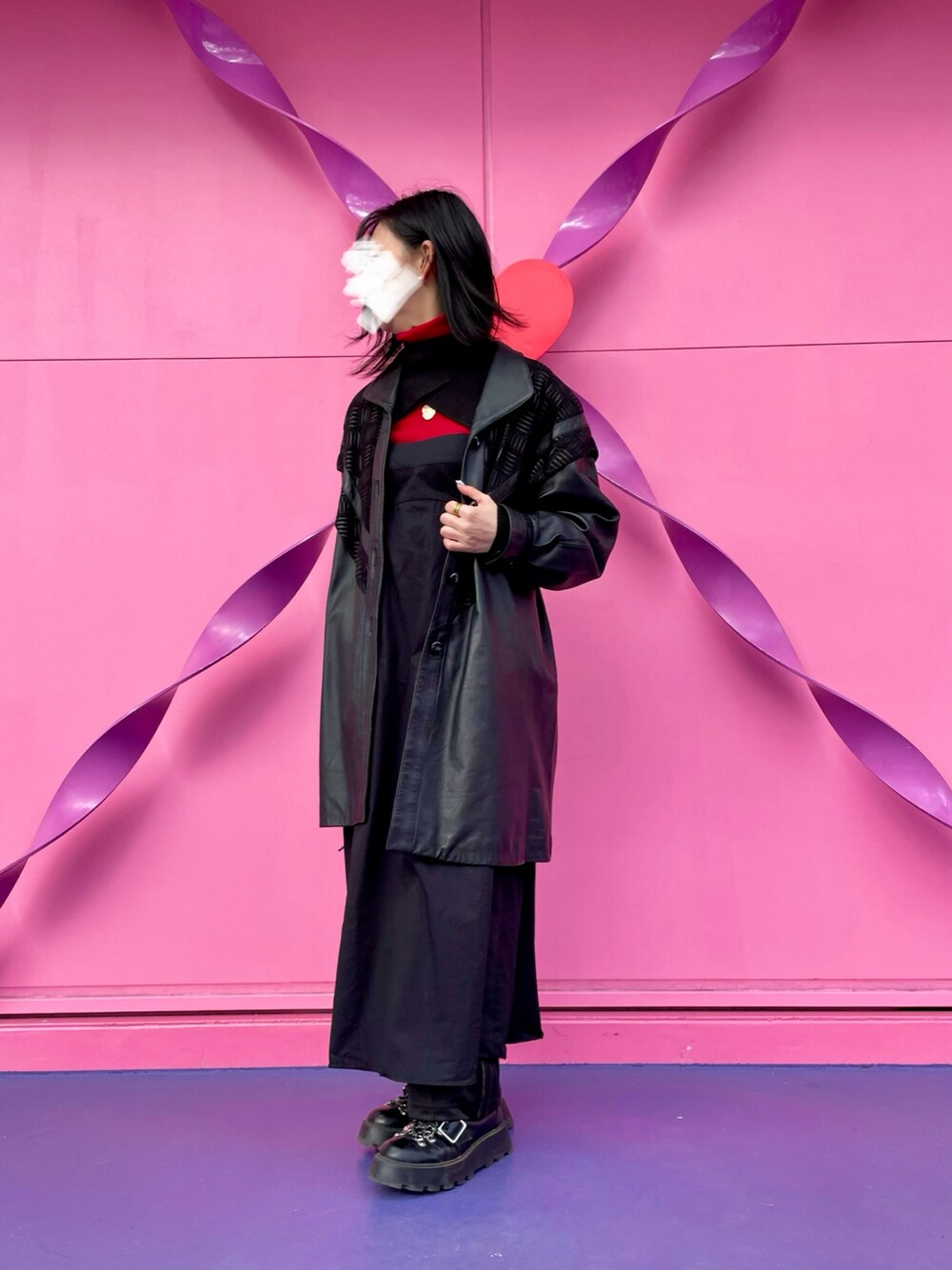 ブラックx赤🍅 赤のタートルネックのニットにキャミのロングワンピース、短いニットを重ねて赤の色の量を調節。 レザーの古着のコートと強めなブーツでオールブラック コーデに🐦⬛