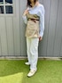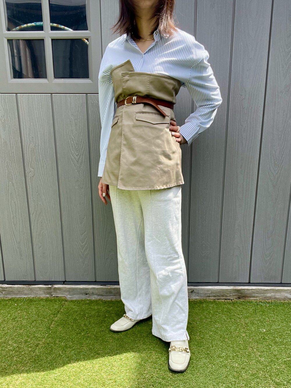 ストライプシャツにベージュのビスチェを合わせました🌸 ベルトでウエストマークをしてメリハリをつけてみました。 ボトムはスウェットパンツで大人カジュアルに。
