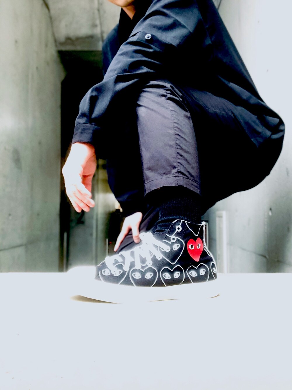 ブラックコーデ♪ スニーカーはギャルソンプレイとコンバースコラボ💡 以前ドーバーストリートで一目惚れで買いました♪ 最近黒ばっかりなので、そろそろ柄モノに戻します🌟
