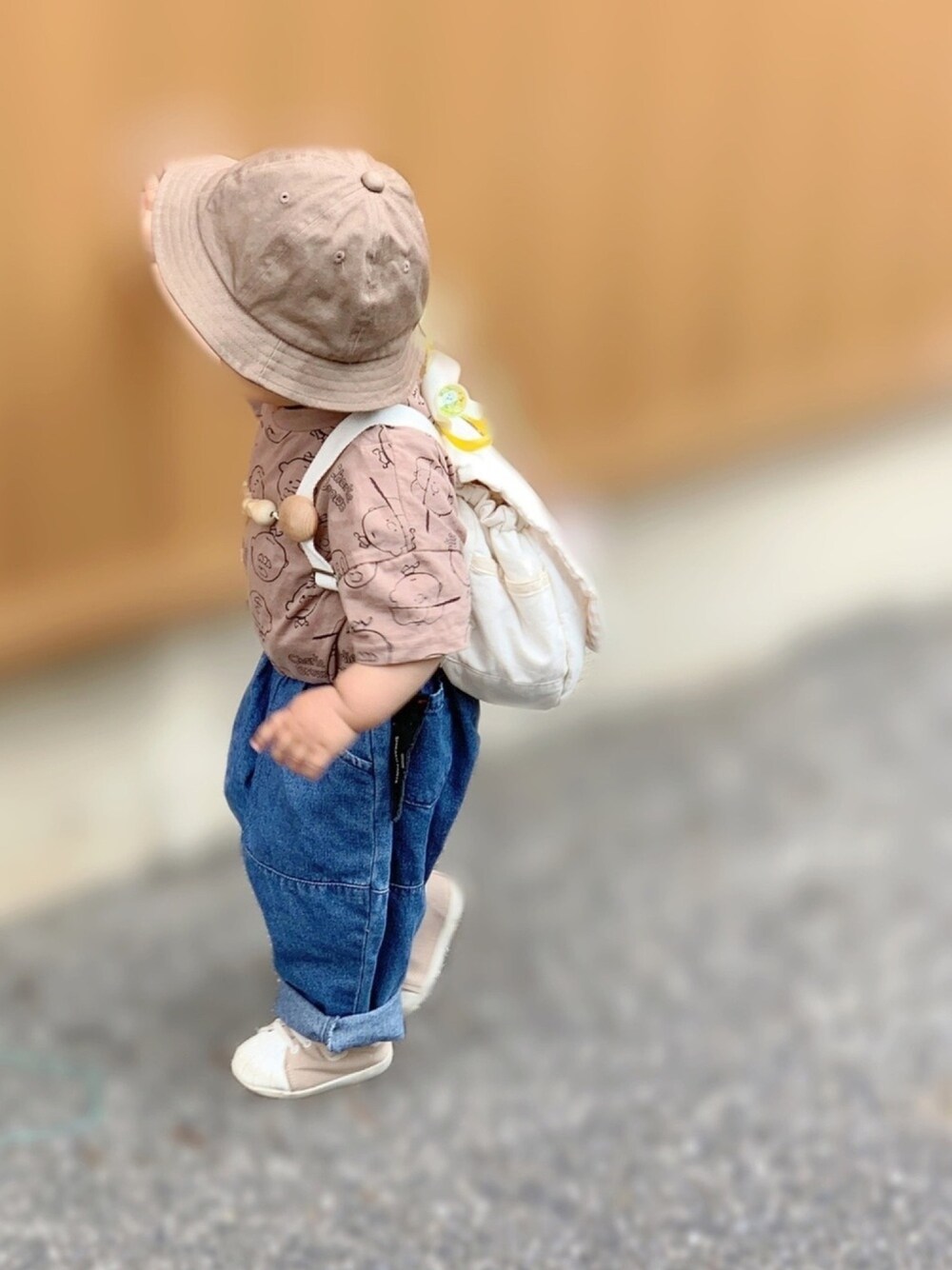 ⚘⚘ チャーリーブラウンのトップスを着せたくて☺︎ 公園行く時なのでTシャツ×デニムパンツでシンプルに◎ パンツの形がバルーン形で可愛い❤︎゛