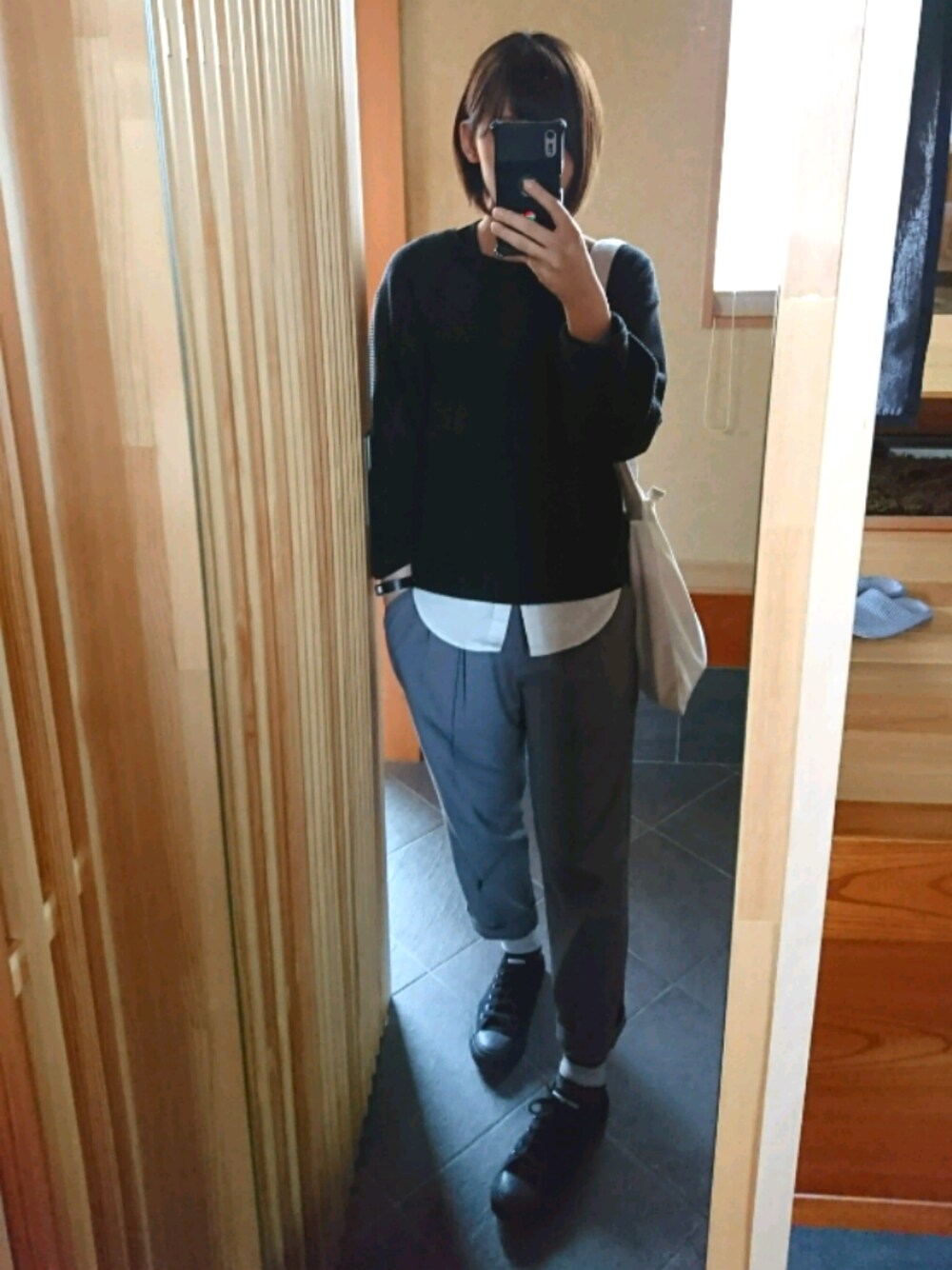 珍しく仕事前に余裕があったので📷 お仕事着はいつもパンツです。 なんたって寒い。寒過ぎる⛄ そして黒い靴が定番👟