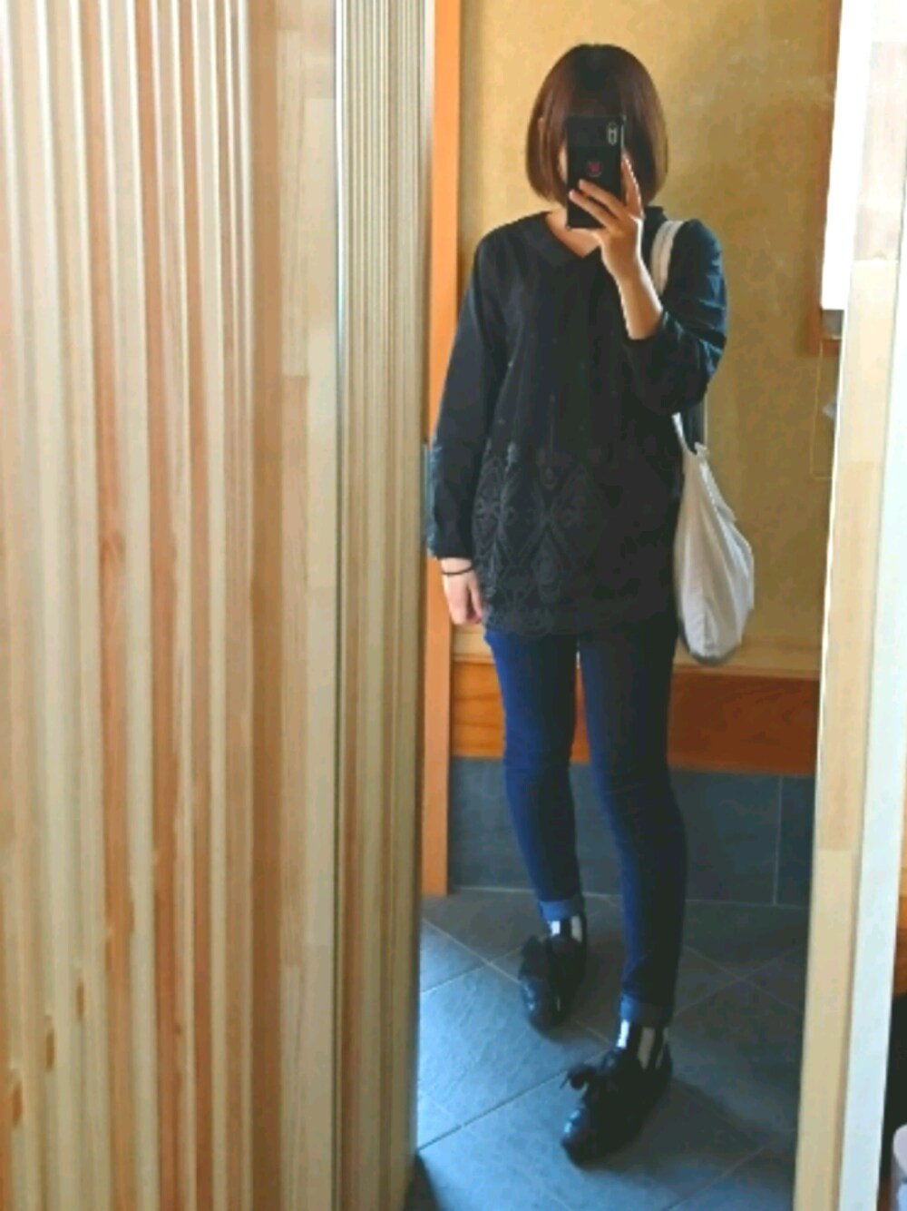 お仕事着👚 タグ?を端に寄せる技を覚えました(遅) SUPERHAKKAのブラウスは母から。 自分では手が届かないお値段…👼