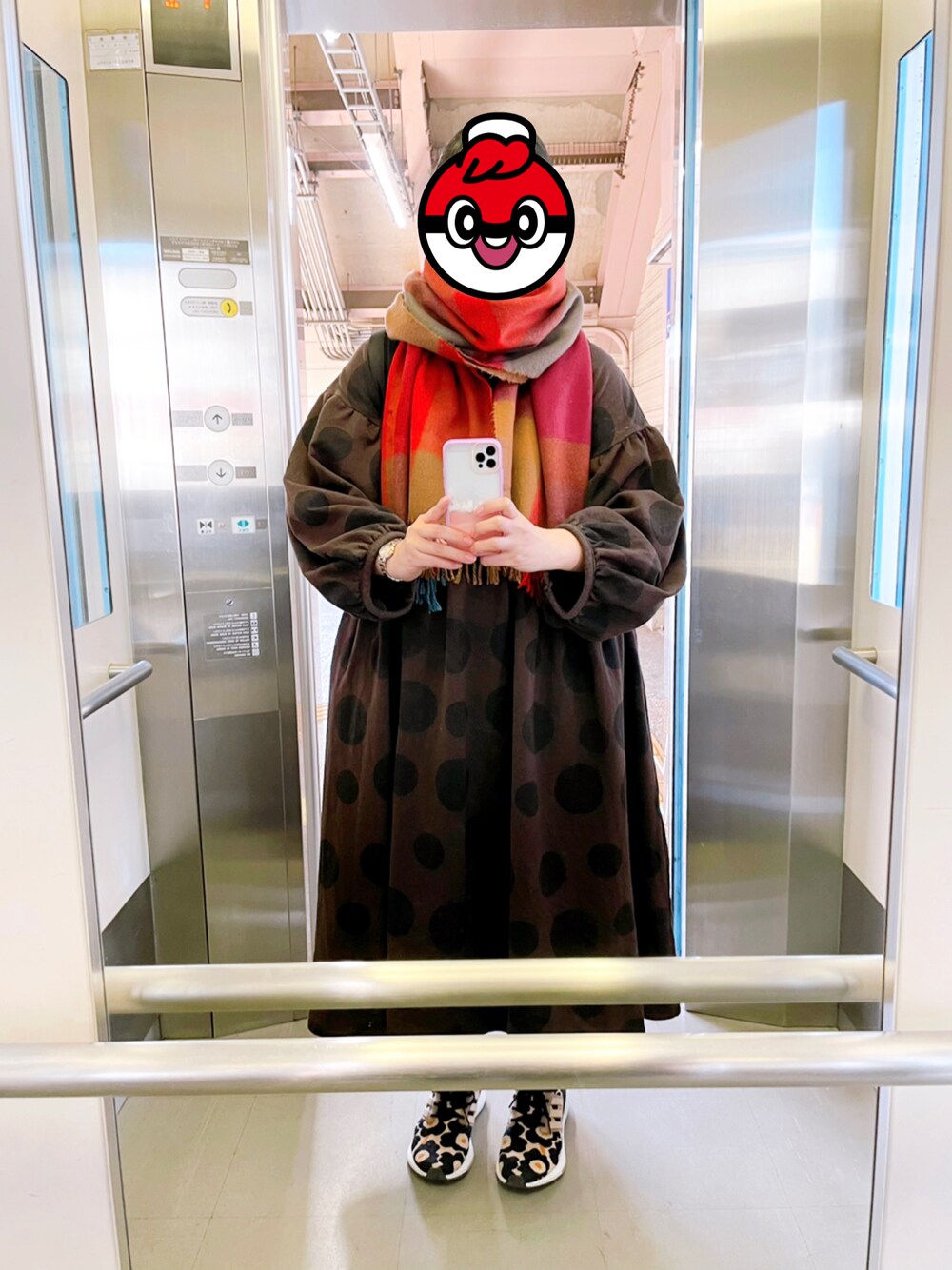 こういう大判のマフラー(ストール)を巻いている人を今年はよく見かけるので、真似してみました。かなりの存在感で、肩まわりのデブ感から目を逸らしてもらえる気がします。