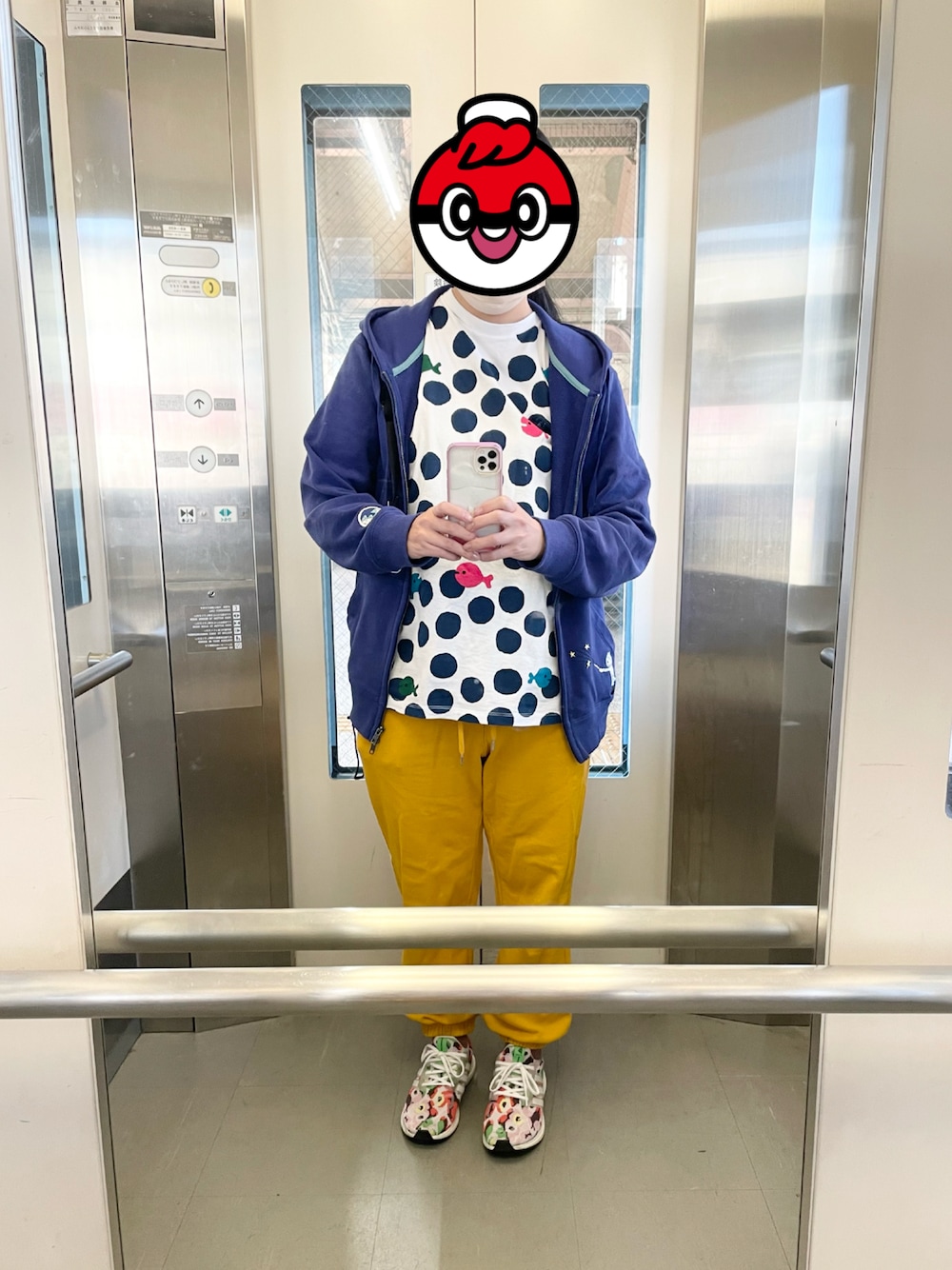 前々回と同じ上半身コーデなのですが、黄色いズボンで変化をつけてみました。