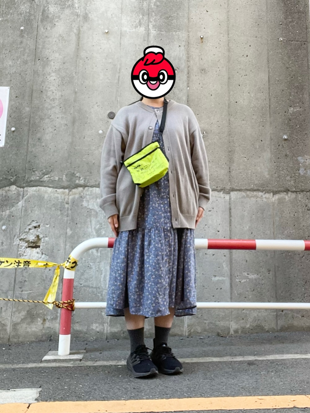 差し色に、レトロな国鉄コンテナのサコッシュを購入しました。GUのカーディガン(リラックスフィットクルーネックカーディガン)はユニセックスのXLです。