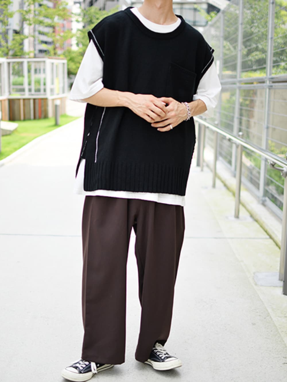 kutir8/6(火)21:00〜新作リリース! 待望のニットベストが遂にデビュー!! マストトレンドのニットベストに kutirらしいデザイン性をプラスした1枚! 胸ポケディテールや 配色のステッチが程よいデザインポイントに。 ブラックだからこそ存在感を増す 白の配色ステッチがオシャレな1枚。 ベスト L ¥2,295(tax in) Tシャツ L ¥1,995(tax in) パンツ M ¥3,595(tax in) 【kutirメンズインスタではお得な情報や新作情報を先行で配信中!instagram→kutir_men】