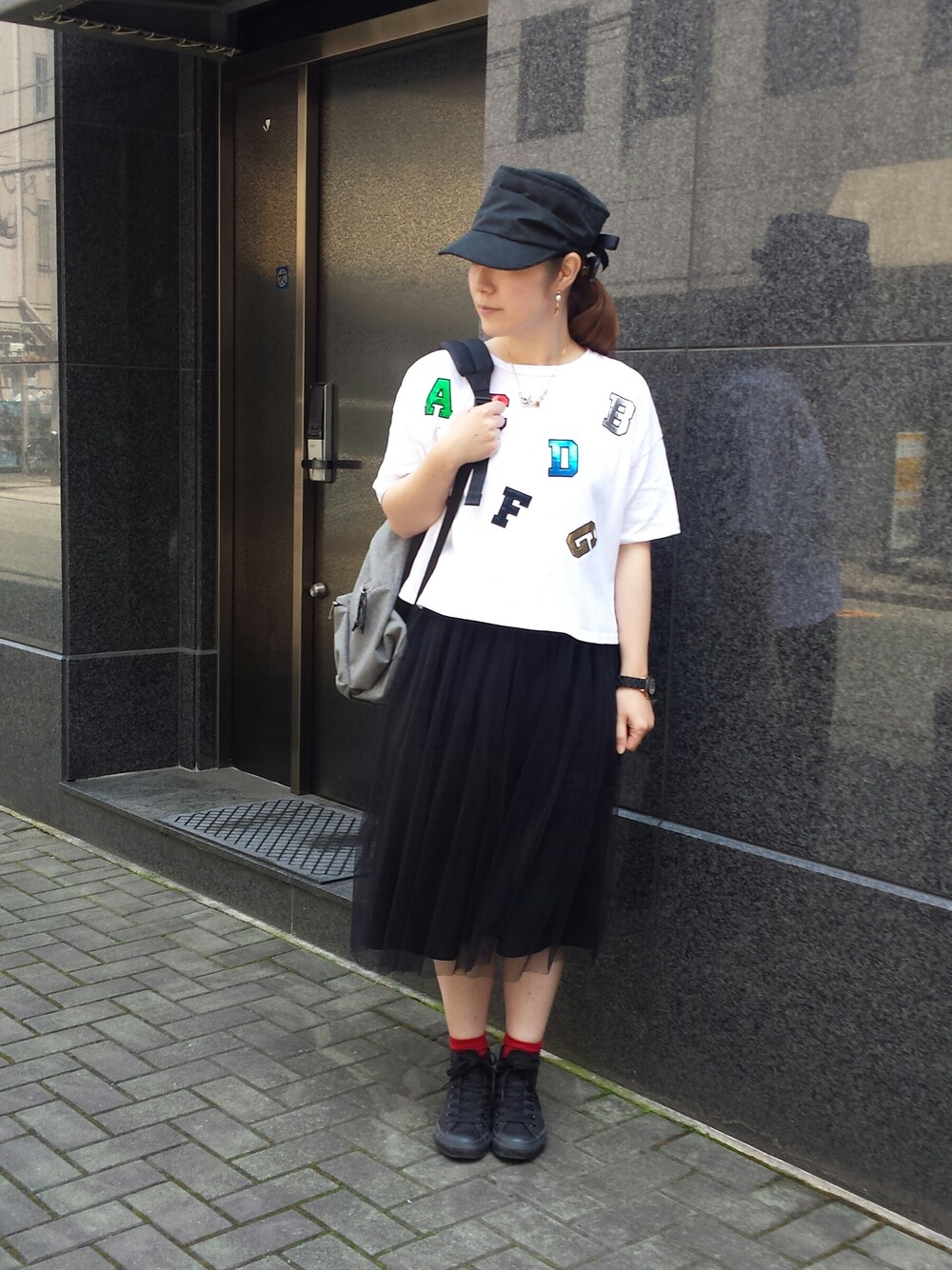 シューズ:コンバース このTシャツは配色とアルファベットの配置がツボ!