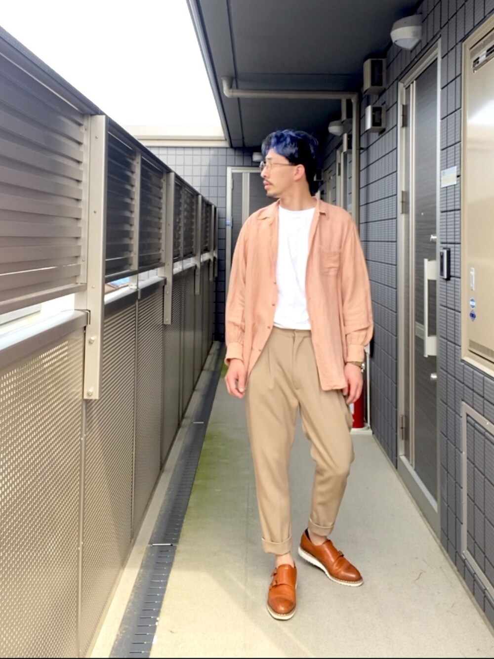 休日コーデ リネンシャツベージュコーデで優しいお兄さん風